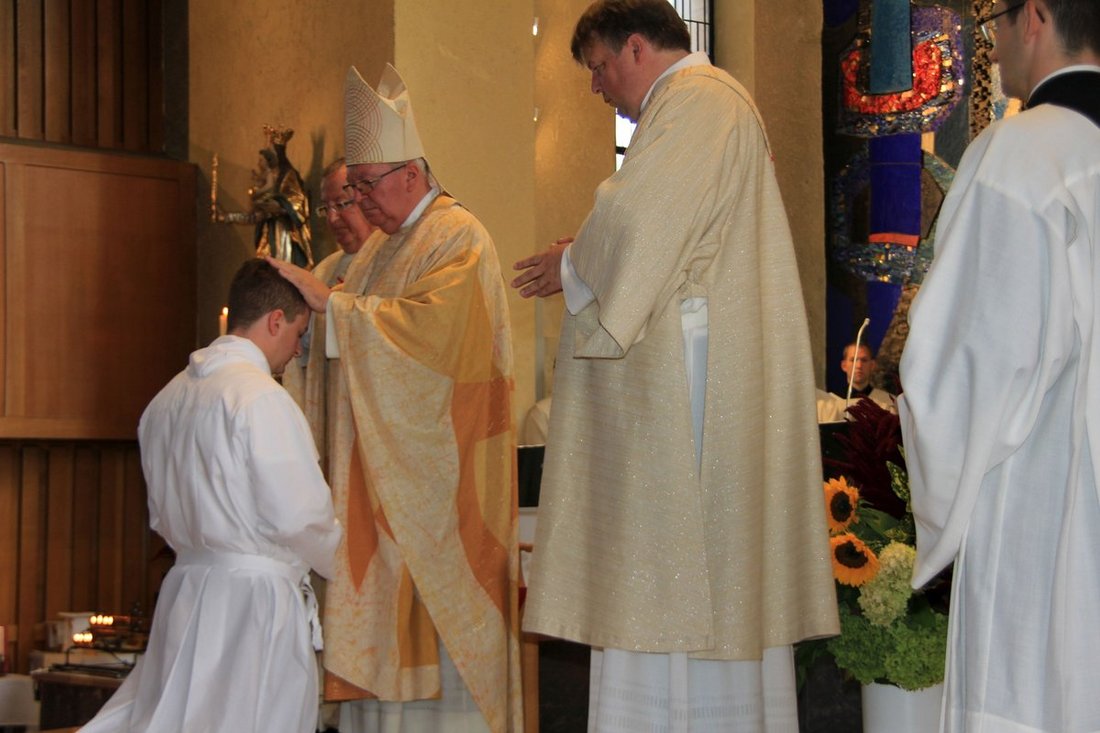 Am 17. September 2016 wurde ich zusammen mit fünf weiteren Männern in Homburg/Saar in einem festlichen Gottesdienst von Weihbischof Georgens zum Diakon geweiht. Von da an durfte ich taufen, beerdigen und trauen, was für mich ganz tolle Erlebnisse waren. Mit dem Weißen Sonntag 2017 habe ich auch meine Zeit in Herxheim beendet und bin für den letzten Feinschliff bis zu meiner Priesterweihe im neu eingeweihten Priesterseminar in Speyer.