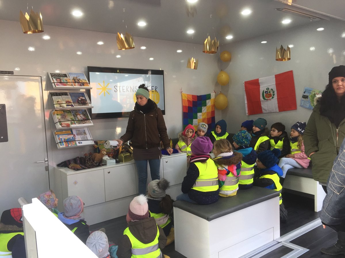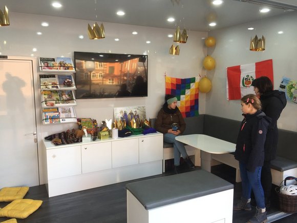 Am vergangenen Freitag, 23.11. war es dann soweit und das Sternsingermobil kam nach Schifferstadt, dem einzigen Stopp in der ganzen Diözese Speyer überhaupt. Die Mitglieder des Pfarreirates, allen voran Stefanie Bengert und Jürgen Reimer, hatten gute Vorarbeit geleistet, zahlreiche Gruppierungen dazu eingeladen und die Aktion bekannt gemacht. So fanden sich am Freitagvormittag 53 Vorschulkinder der Kindertagesstätten Herz Jesu, St. Jakobus und St. Konrad ein, die im Sternsingermobil, das im Hof des Pfarrzentrums St. Jakobus aufgestellt war, mit dem Dreikönigssingen, der größten Solidaritätsaktion von Kindern für Kinder weltweit, vertraut gemacht wurden. Denn die junge Tourbegleiterin Susanne Zander vom Kindermissionswerk Aachen verstand es vortrefflich, auf kindgerechte Art und Weise das Motto der diesjährigen Aktion "Segen bringen, Segen sein. Wir gehören zusammen – in Peru und weltweit", mit der behinderte Kinder unterstützt werden sollen, zu vermitteln. Sei es im Basteln einer "Königskrone", bei Mitmachaktionen, beim Anprobieren der Gewänder, dem Kennenlernen des Landes und der Situation deren behinderter Kinder, fand sie stets den richtigen Ton.