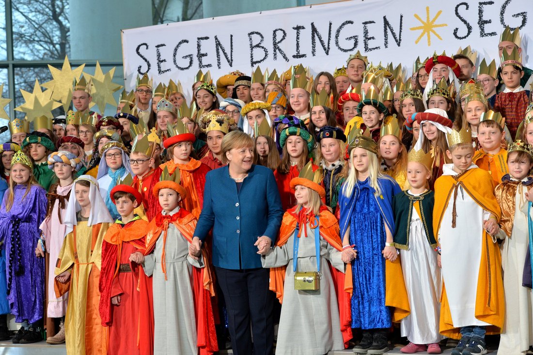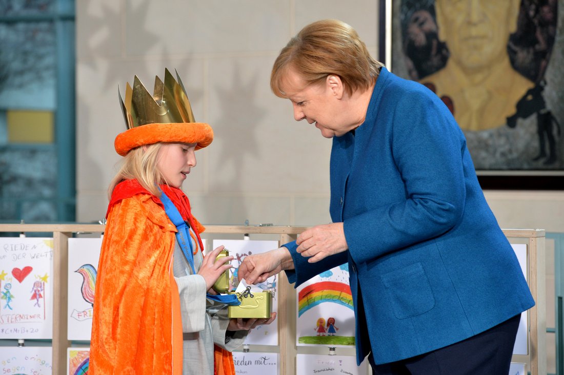Jeweils vier Sternsinger aus allen 27 deutschen Diözesen vertraten in Berlin die 300.000 engagierten Mädchen und Jungen, die sich rund um das Dreikönigsfest bundesweit in mehr als 10.000 katholischen Pfarrgemeinden und Einrichtungen an der 62. Aktion Dreikönigssingen beteiligen. „Segen bringen, Segen sein. Frieden! Im Libanon und weltweit“ ist das Motto der 62. Aktion Dreikönigssingen. Bundeskanzlerin Angela Merkel dankte den Sternsingern für ihr Engagement in Deutschland. Eine ganz besondere Aufgabe übernahmen die Sternsinger Johanna (10), Theresa (10), Armin (10) und Justus (10) aus der Gemeinde Zum Guten Hirten in Cottbus (Bistum Görlitz): Sie schrieben den Segen „20*C+M+B+20 – Christus mansionem benedicat, Christus segne dieses Haus im Jahr 2020“ im Kanzleramt an. Ein großes Bild einer Hauswand in einem Kriegsgebiet, voller Einschusslöcher, verwandelten die Sternsinger in 27 Friedensbotschaften. Sternsinger Tobias (13) aus der Gemeinde St. Johannes Baptist in Jena (Bistum Erfurt) präsentierte die Botschaften Bundeskanzlerin Angela Merkel.