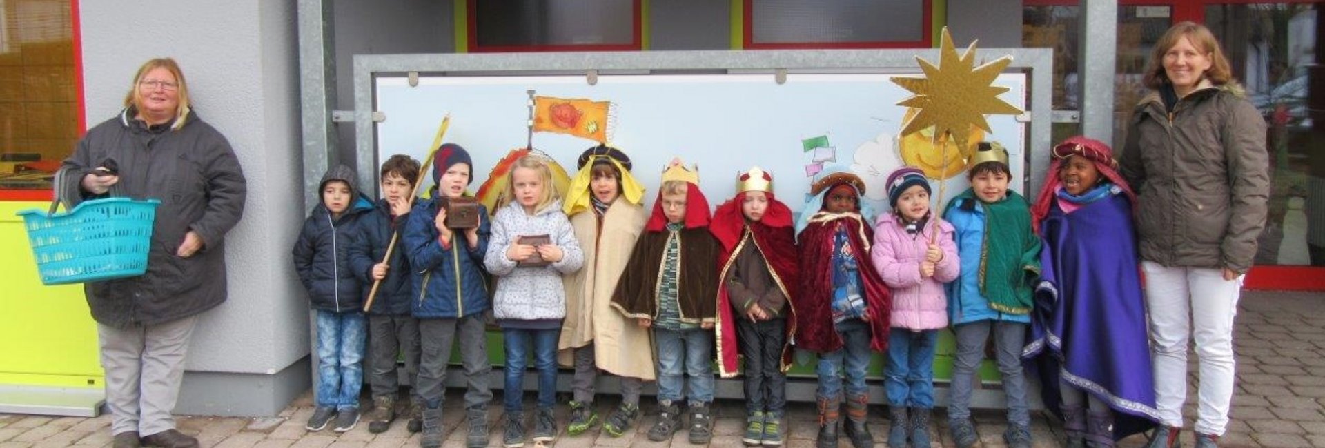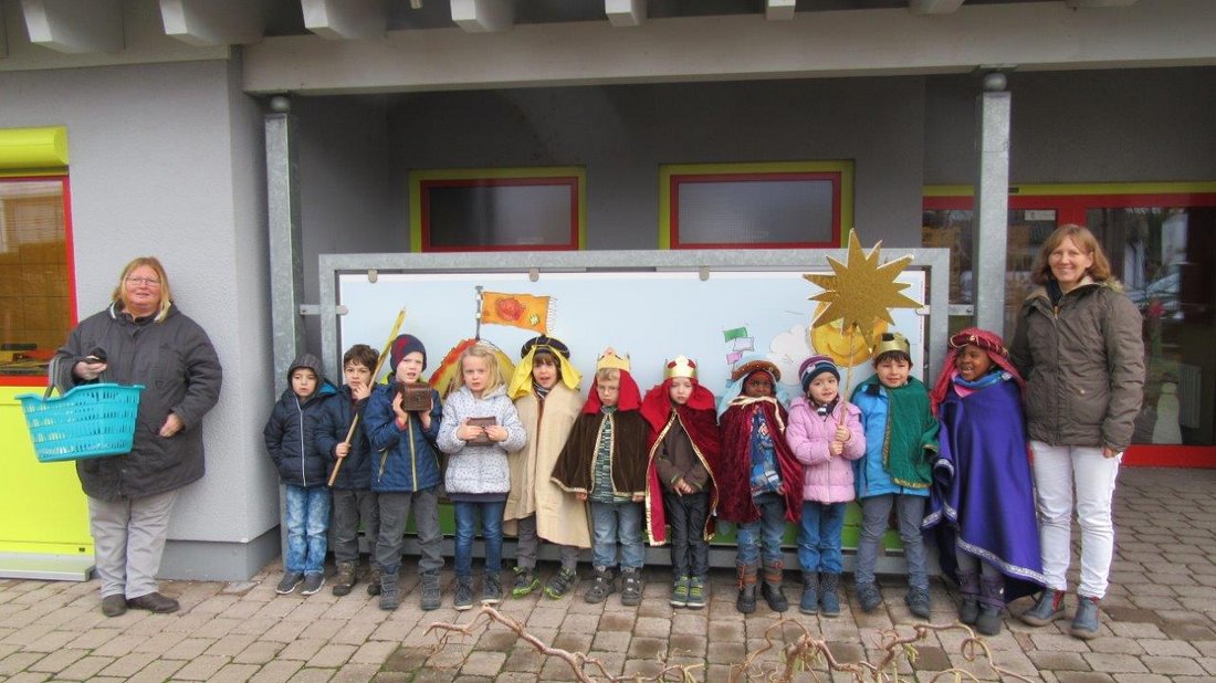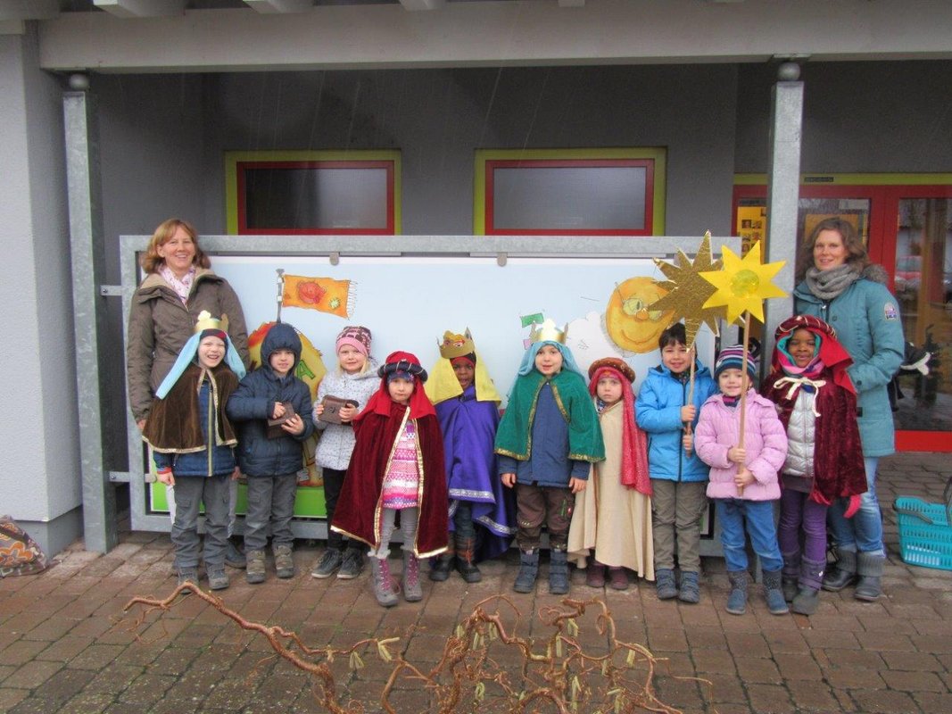Am 4./5. Januar zogen zwei Sternsingergruppen aus Kindergartenkindern in der Bleichstraße und im Bachgarten von Haus zu Haus und brachten den Segen in die Häuser. Mit viel Freude und Eifer klingelten die Kinder und erwarteten mit Spannung, was in die Kasse oder in die Tasche für die Süßigkeiten wandern würde. Erstaunen gab es auch über die Reaktion mancher Hausbewohner. Die meisten nahmen die kleinen Könige freundlich auf. Manches Mal ließen sie uns in ihre Häuser, zeigten uns die Krippe und den Tannenbaum. Es gab aber auch Menschen, die unser Singen ablehnten und uns weiterschickten.