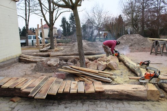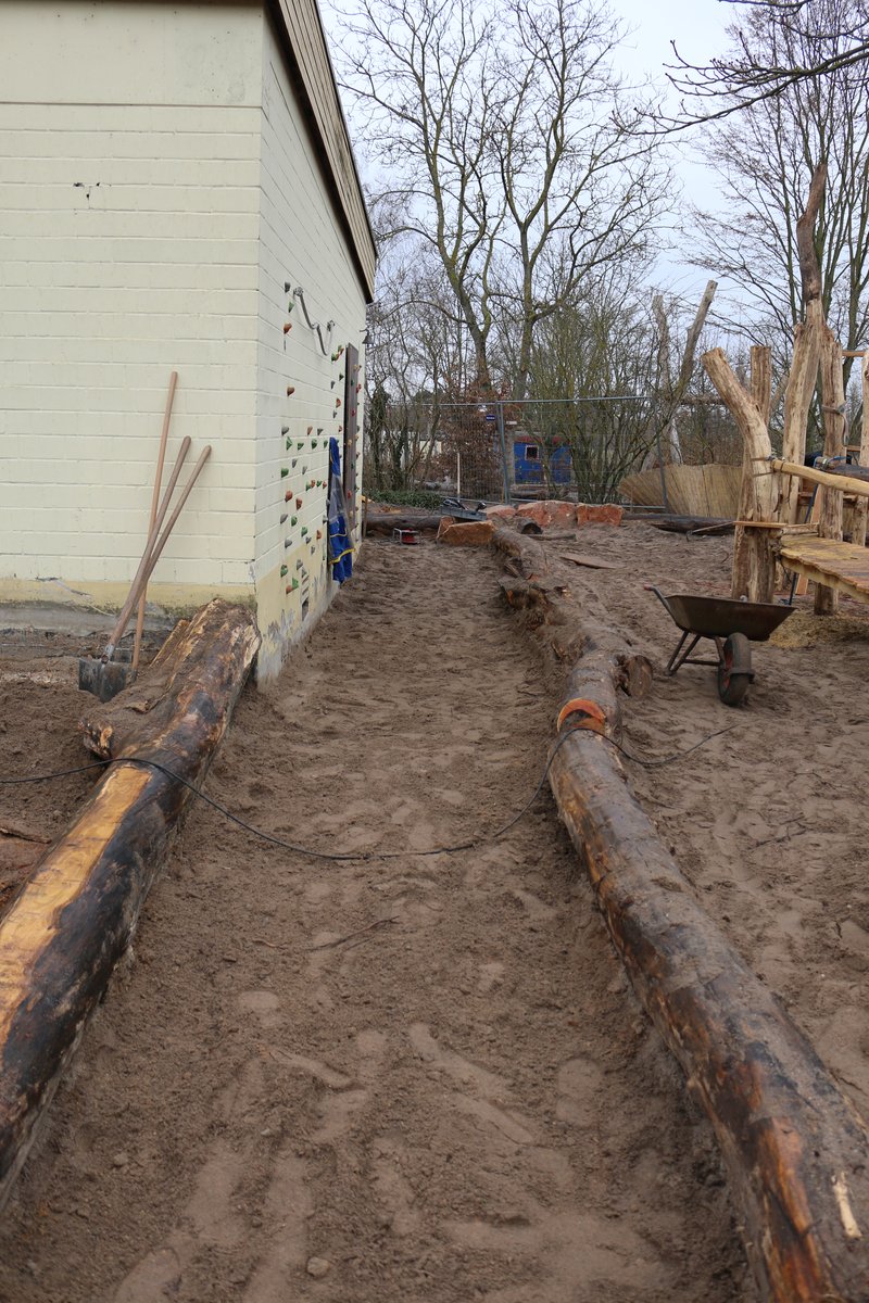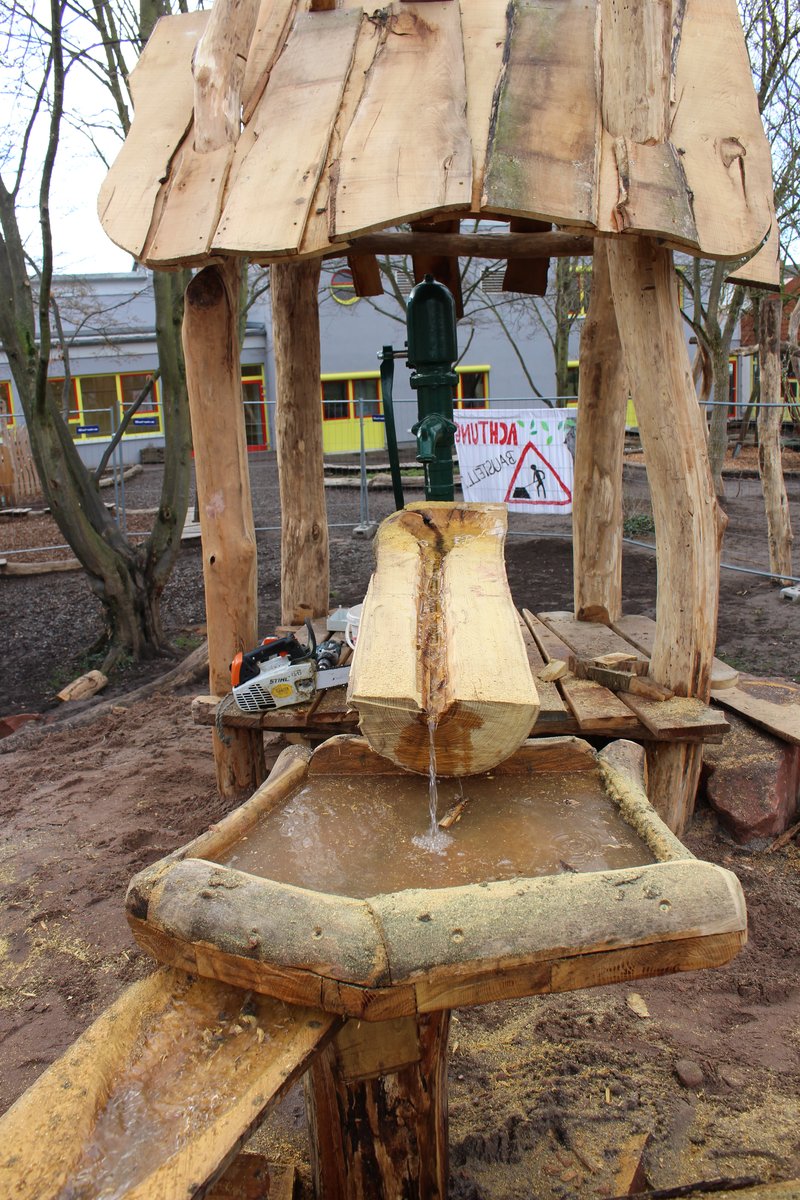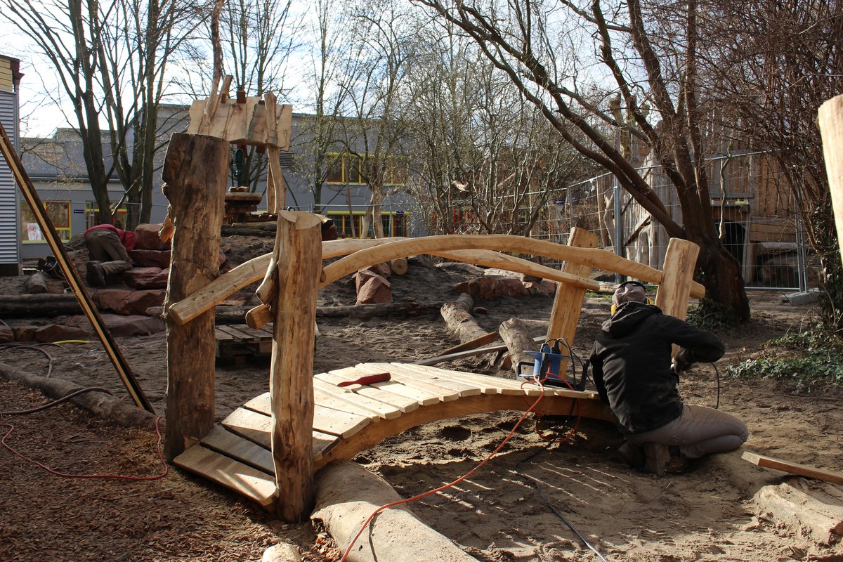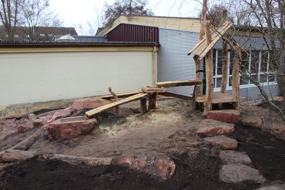 Wasserrinnen und ein Matschtisch aus Robinienholz wurden gefertigt und an Ort und Stelle platziert. Die Pflanzflächen auf dem Hügel wurden vorbereitet. Eine Holzbrücke überragt nun den Sand- und Matschbereich.