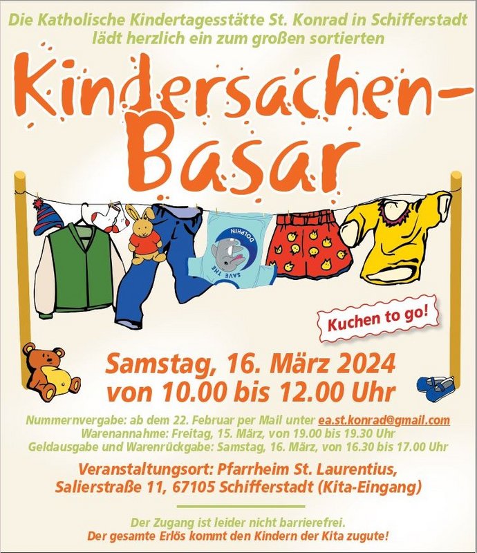 Die katholische Kindertagesstätte St. Konrad in Schifferstadt lädt herzlich ein zum großen sortierten Kindersachen-Basar.