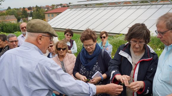 Von dort aus ging es mit dem Bus in den Kräutergarten der Klostermühle nach Edenkoben, den der Schifferstadter Klaus Schlosser 2014 angelegt und sich zu einer Führung bereiterklärt hatte. Die Mauern um das Gelände und auch die des Gebäudes sind aus hellem Sandstein gefertigt und tragen mit den stilsicheren wie schlichten Sitzgruppen zum mediterranen Flair bei. In diesem herrlichen Kräutergarten konnte man auf 6000 Quadratmetern die Vielfalt und den Genuss von Heilkräutern, Duft- und Gewürzpflanzen, sowie alter und neuer Gewürzpflanzen entdecken, die in verschiedene Themenbereiche eingeteilt sind. So gibt es 45 Arten von Lavendel. Im Sommer wird dann aus den reifen Lavendelblüten in einer eigens dafür gefertigten, gläsernen Destille das erste Pfälzer Lavendelöl gewonnen.