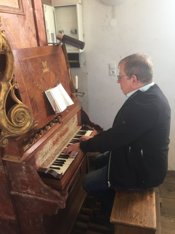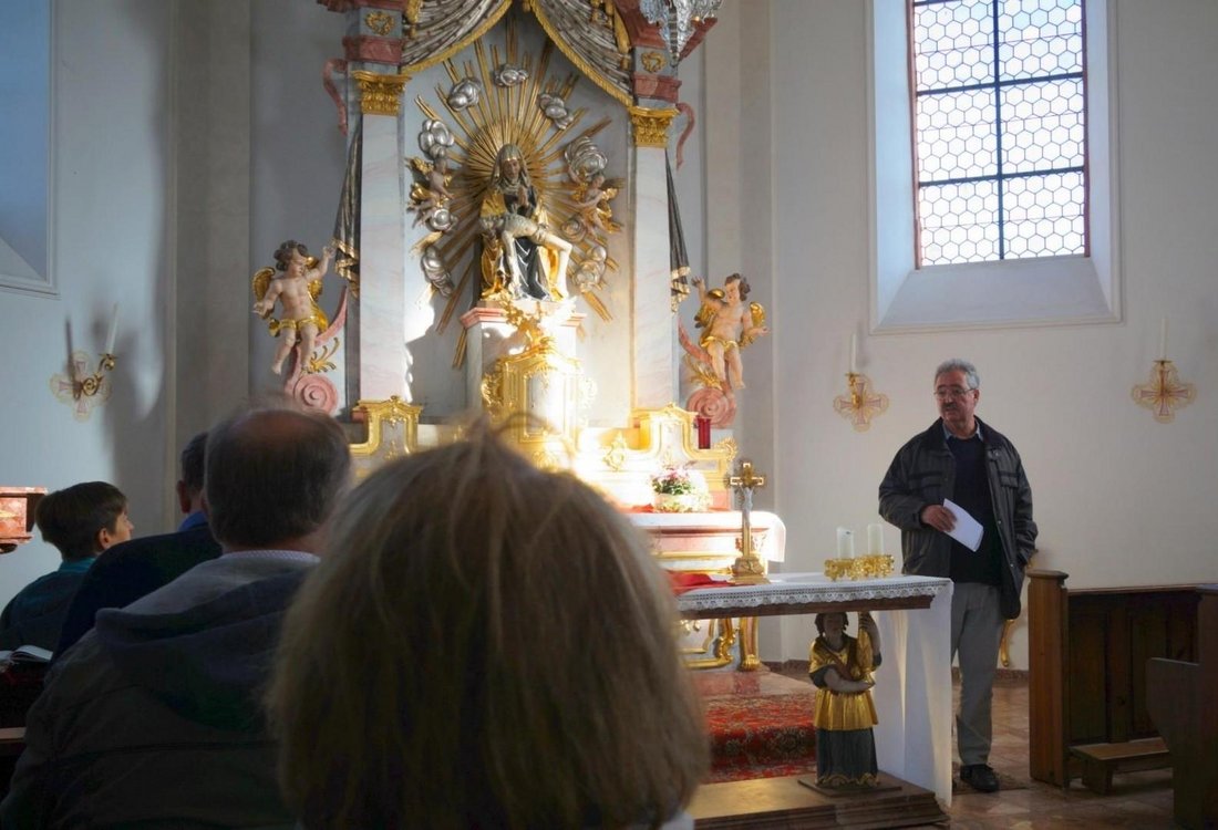 In diesem Jahr ging es zunächst mit dem Bus nach Kirrweiler zur Marienkapelle „Mater Dolorosa“, („Schmerzreiche Mutter“). Dort empfing Pfarrer Peter Nirmaier die Reisegruppe, denn Kirrweiler ist eine seiner zehn Ortschaften in der Pfarrei, in der er seit 15. November 2016 als leitender Pfarrer tätig ist. Vor dem Ökumenischen Gottesdienst gab er Erklärungen zu dieser wunderschönen Kapelle, die in der Zeit des Barock um 1765 bis 1769 als Nachfolgerin einer kleinen Feldkapelle entstand. Sie ist inzwischen mit aufwendigen Stuckarbeiten und herrlichen Deckengemälden versehen. Die vorhandene Orgel, eigentlich von Johann Phillip Seuffert für die Pfarrkirche geschaffen, wurde 1970 hierher verlegt und ist nahezu noch im ursprünglichen Zustand erhalten. Für die Freunde der klassischen Musik sind die hier im Sommer stattfindenden Kammerkonzerte ein besonderes Erlebnis.