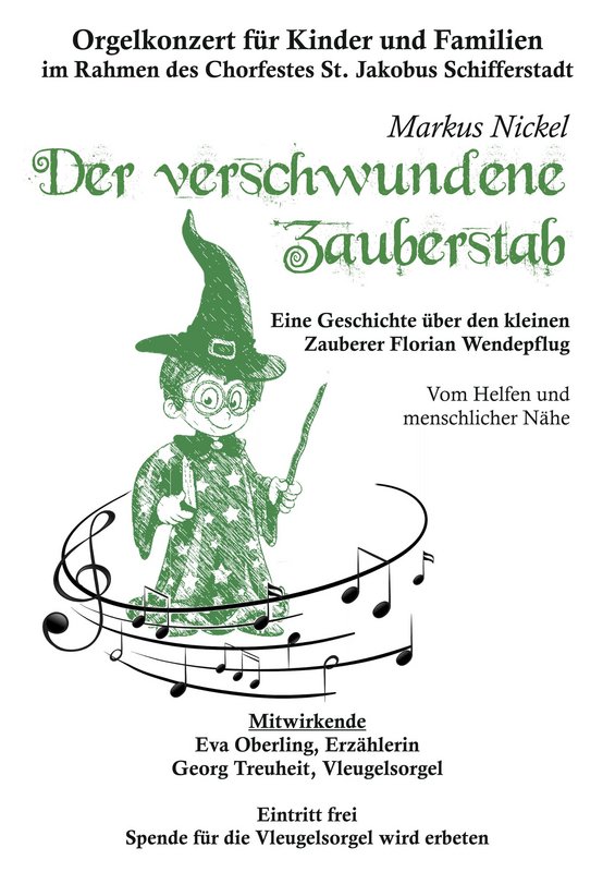 Am Nachmittag, um 15:30 Uhr können Sie und Ihre Kinder uns auf die Orgelempore begleiten. Unsere Chorleiter spielen ein Konzert für Kinder und Familien. "Der verschwundene Zauberstab" von Markus Nickel ist eine Geschichte für Erzähler und Orgel. Der kleine Zauberer Florian Wendepflug ist auf der Suche nach seinem Zauberstab und erlebt dabei so einiges. Eine Geschichte über Begegnungen und Menschlichkeit. Die Erzählerin ist Eva Oberling. Untermalt werden die Ereignisse mit dem Orgelspiel von Dekanatskantor Georg Treuheit.