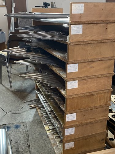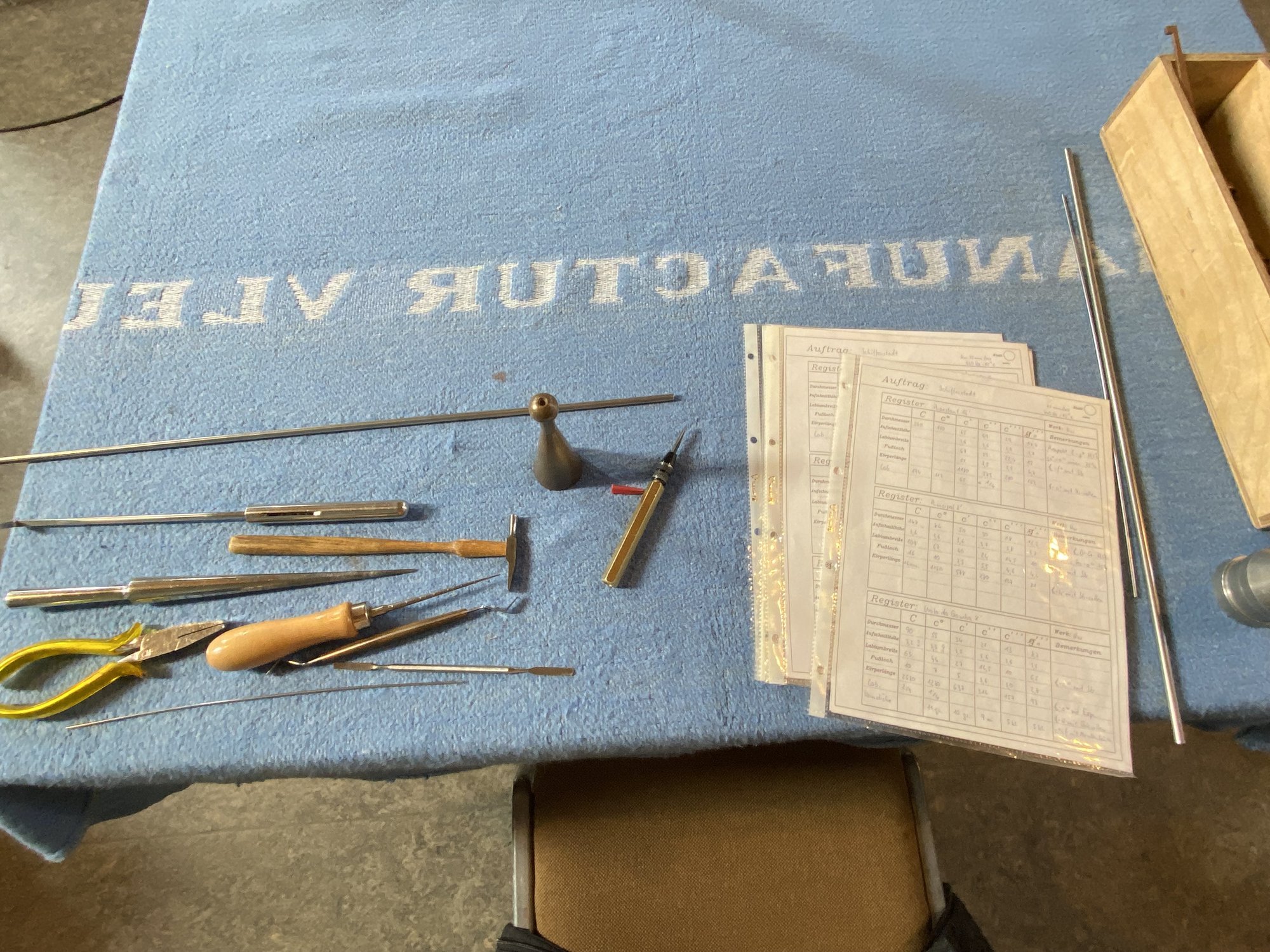 Die, die dieses Durcheinander wirklich fachmännisch im Griff haben, sind die Mitarbeiterinnen und Mitarbeiter der Orgelmanufactur Vleugels, die derzeit mit Hochdruck an der Reinigung und Instandsetzung des wundervollen Instruments arbeiten. Die sichtbaren Werkzeuge, aber auch die gelagerten Pfeifen und Mechaniken lassen erahnen: hier sind Profis am Werk, die ihr Handwerk - und es ist wirklich 100%-iges Handwerk - beherrschen. Sorgfältigkeit und Sorgsamkeit sind auch in diesem "Chaos" zur erkennen. Respekt!