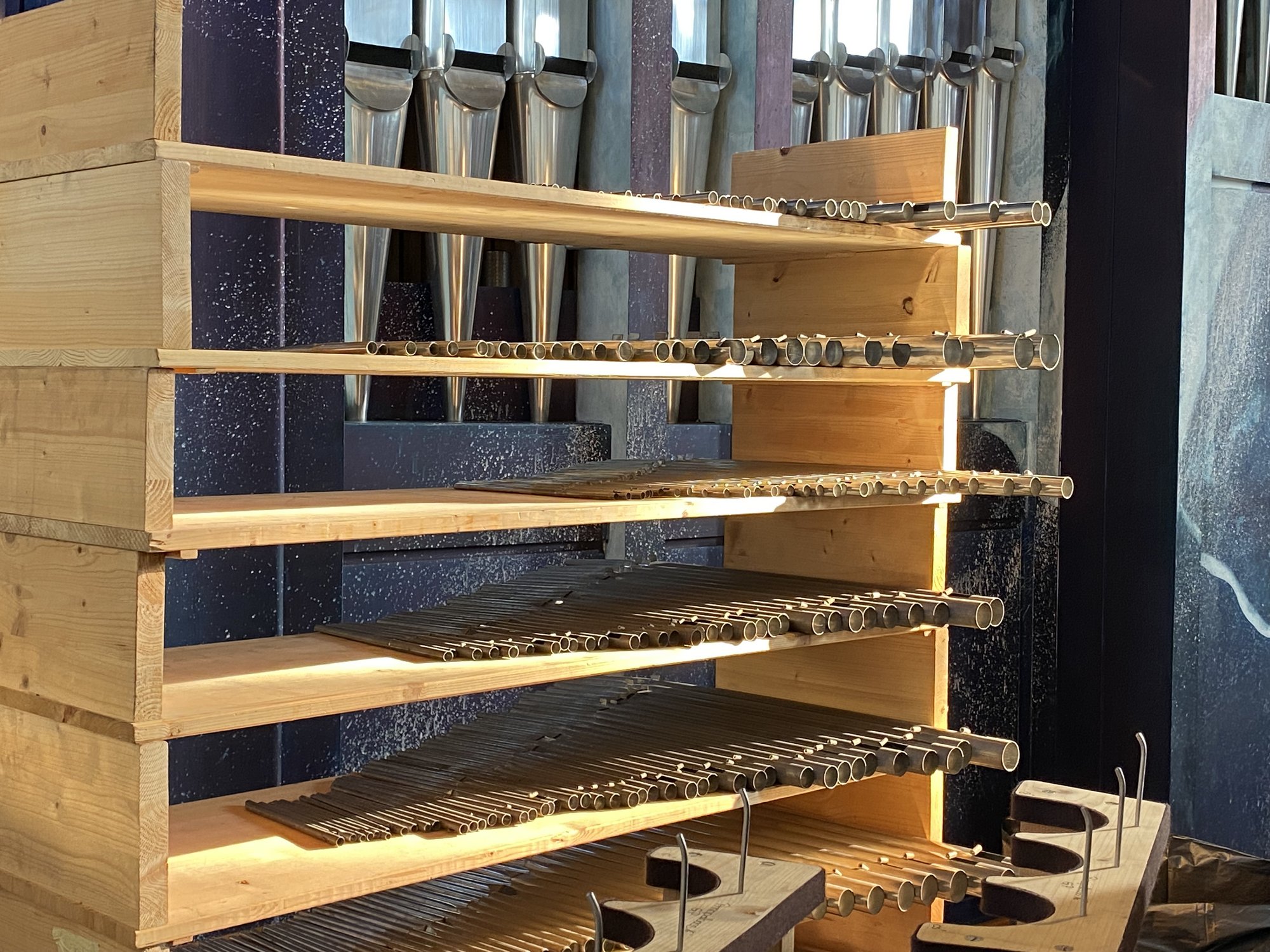 Übrigens: Die Arbeiten haben bereits Anfang November begonnen. Sie überlappen sich mit den Arbeiten an der Elektroanlage. Da auch an der Orgel die Elektronik erneuert werden muss, ergeben sich hier gute Synergieeffekte.