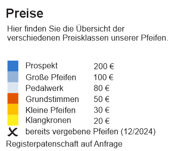 Als Patin und Pate erhalten Sie eine Patenschaftsurkunde und werden, wenn gewünscht, auf der Patenschaftstafel benannt. Es gibt nach der Renovierung eine klingende Vorstellung der Paten-Orgelpfeifen als Konzert in der Kirche, zu der Sie eingeladen werden.