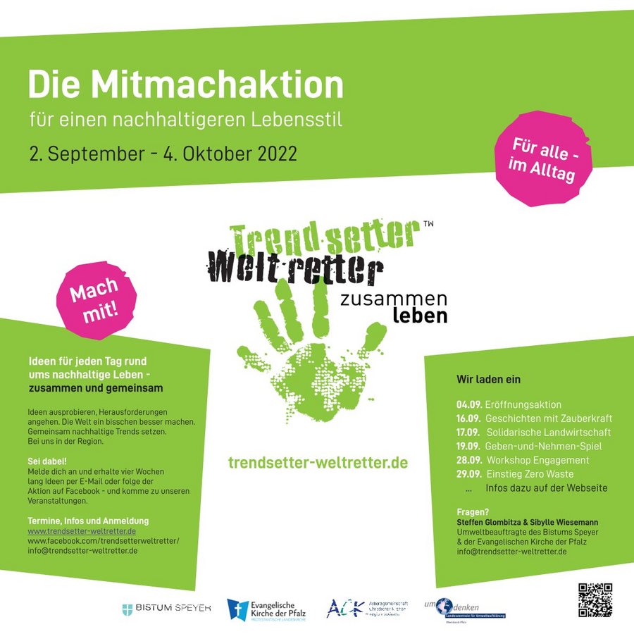 Die vierwöchige ökumenische Mitmachaktion Trendsetter Weltretter findet vom 4. September bis 2. Oktober zum fünften Mal statt. Die Kernbotschaft lautet: Wir sind mit verantwortlich für Gottes Schöpfung. Nur Hand in Hand lässt sich eine Welt schaffen, die Zukunft hat.