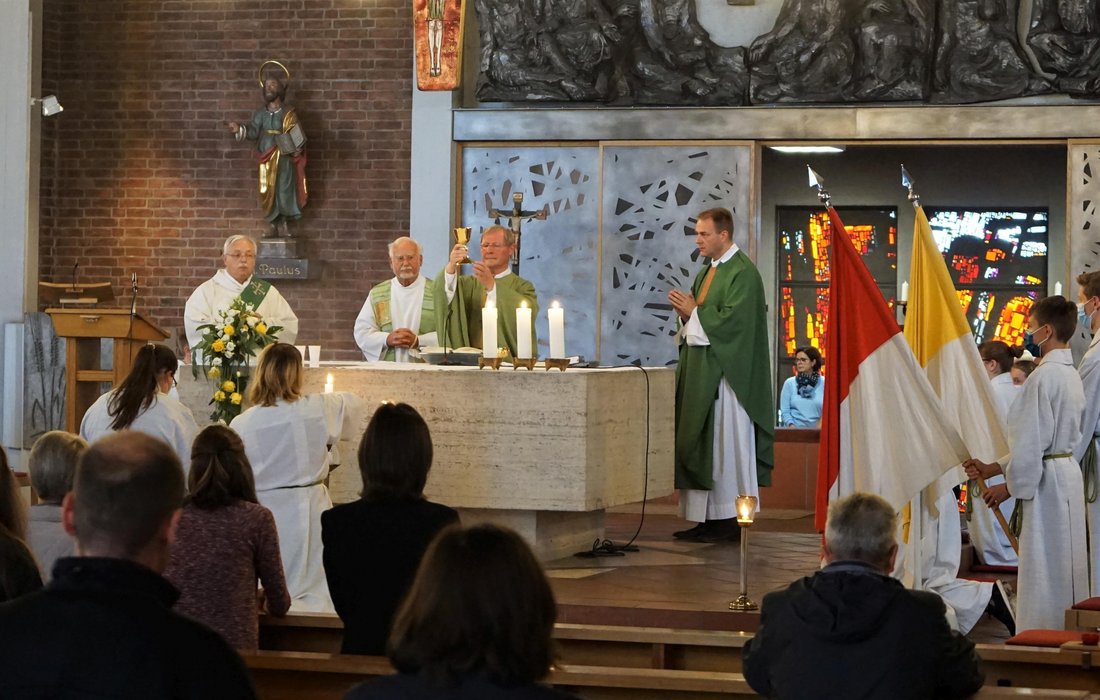 Pfarrer Gerhard Grewer ist am Samstag, 29. August 2021 endgültig aus dem aktiven Kirchendienst ausgeschieden. Den Rahmen dazu bot der Vorabendgottesdienst in der Herz Jesu Kirche, dem er zum letzten Mal vorstand, in Konzelebration mit Pfarrer Dr. Georg Müller, Pfarrer Albrecht Effler und unter Assistenz von Diakon Hans Sattel gefeiert und vom Chor der Herz Jesu Kirche unter Leitung von Silke Winkler festlich umrahmt wurde. Dass seine Beliebtheit nach wie vor ungebrochen ist, zeigte auch das große Interesse an der Teilnahme seines Abschiedsgottesdiensten, denn es konnten nicht alle Gläubigen aufgrund der Coronabeschränkungen daran teilnehmen, so dass einige den Gottesdienst vor der Kirche mitfeierten.