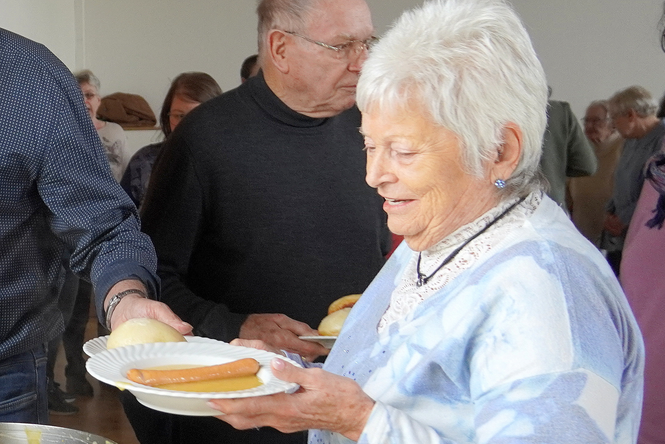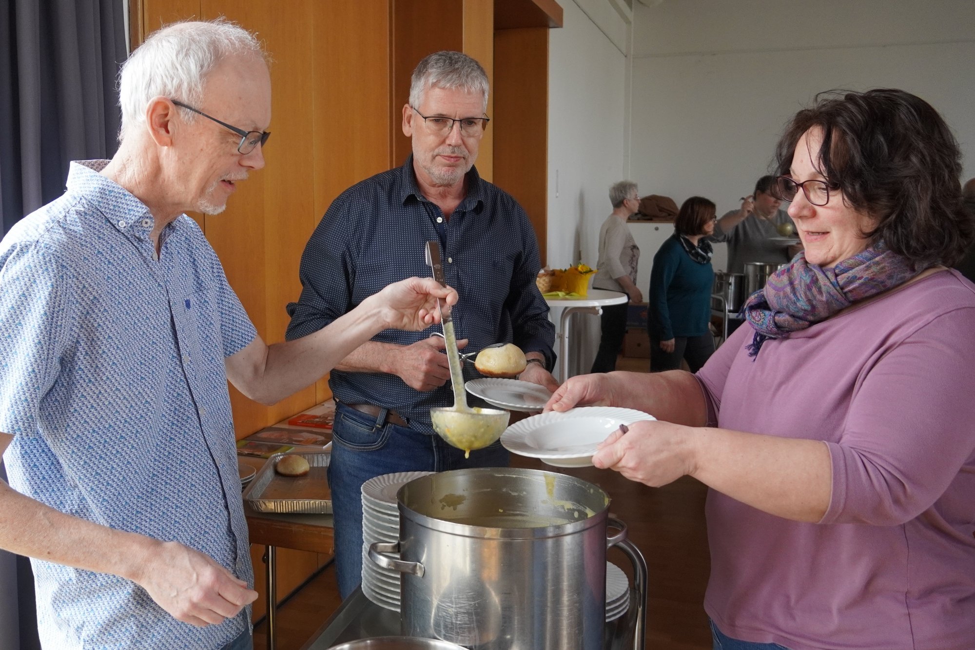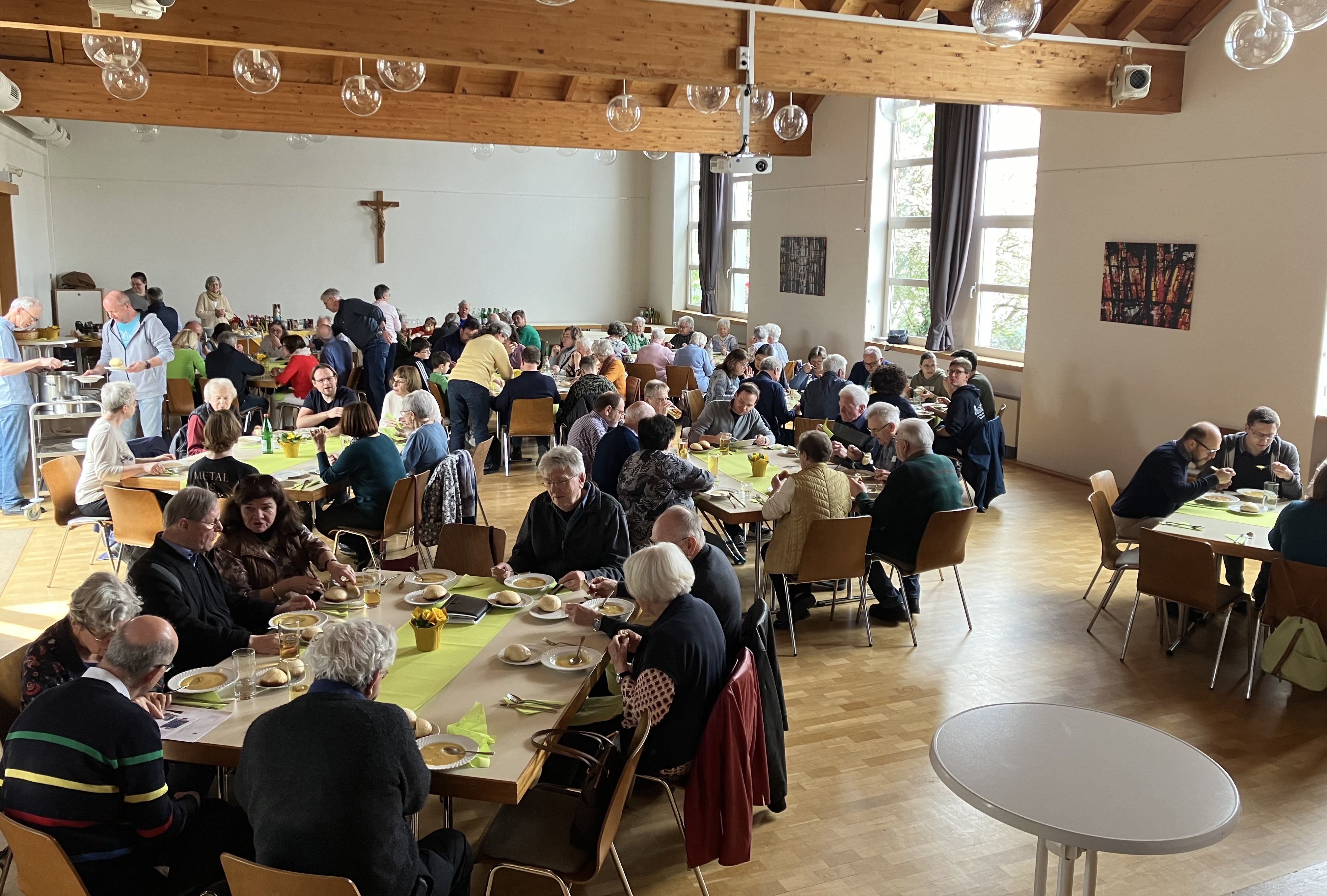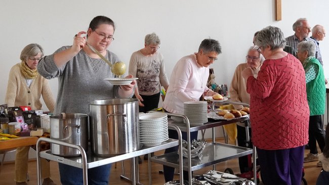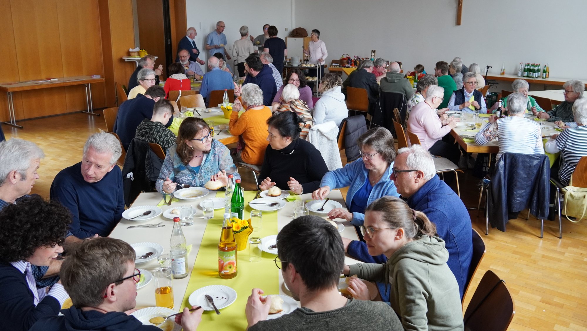 Einen großen Zuspruch hatte das Solidaritätsessen am Sonntag, 17. März 2024, zu dem der Gemeindeausschuss Herz Jesu in das Pfarrheim eingeladen hatte. Dabei zeigten über 100 Gäste um die Mittagszeit ihre Verbundenheit mit dieser Veranstaltung, darunter die Pfarrer Stefan Mühl, Albrecht Effler, Gerhard Grewer i.R. und Pastoralreferent Heinrich Schmith. Ziel des Solidaritätsessens ist es, über das Projekte zu informieren, das damit unterstützt wird. Große Anziehungskraft hat aber auch immer das angebotene Mittagessen. 220 hausgemachte frische Dampfnudeln, zubereitet von Ully Wünstel und Gabi Keßler, und leckere Kartoffelsuppe (auf Wunsch mit Wursteinlage), gekocht von Sigrid Teutsch und Ute Niederer, fanden dann auch problemlos ihre Abnehmer und waren anschließend restlos verspeist.
