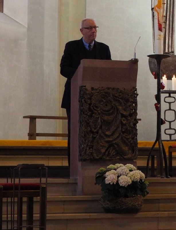 "Es ist wichtig, dass wir an Pfarrer Ernst Ripplinger erinnern und an das, was er angestoßen, gegründet und bewegt hat", hob Pfarrer Dr. Georg Müller zu Beginn hervor. Es soll nicht nur eine Erinnerung sondern auch bleibender Auftrag für die Christen in Schifferstadt sein, auch heute wahrzunehmen, was nötig sei und wie gehandelt werden müsse, so wie es Pfarrer Ripplinger zu seiner Zeit getan habe. Es sei ein großes Lebens- und Glaubenszeugnis, das damit in den Blick genommen werde. Sein Vermächtnis und seine bleibende Aktualität verdeutlichte Pfarrer Dr. Müller anhand von Buchstaben seines Nachnamens.