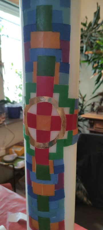 Die Gestaltung unserer diesjährigen Osterkerze steht im Zeichen von und als Zeichen für Vielfalt, Zusammengehörigkeit und Gemeinschaft.