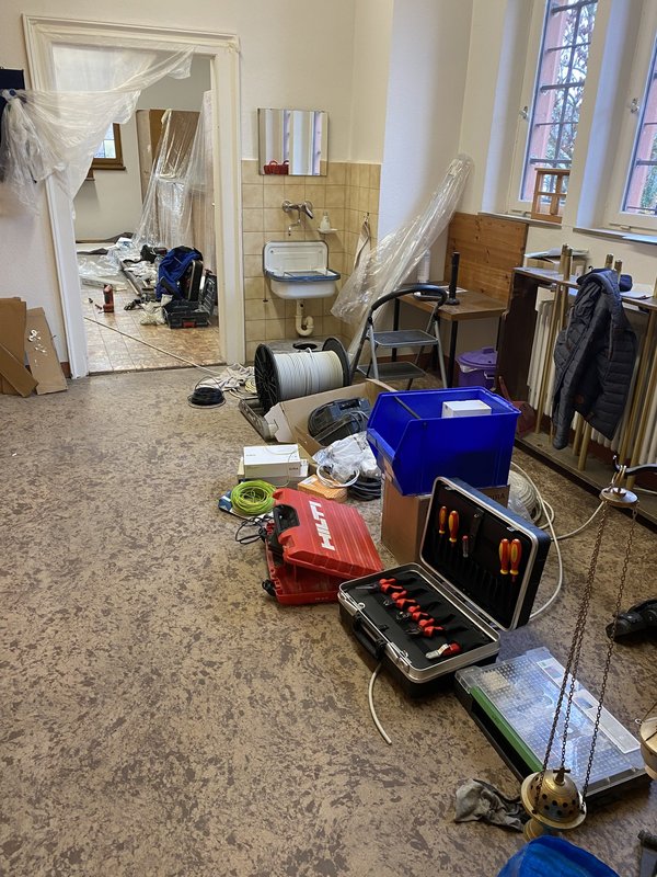 Pünktlich und wie geplant können die Instandsetzungsarbeiten an der Elektrik der Kirche in der kommenden Woche soweit abgeschlossen werden, dass in der Kirche wieder Gottesdienst gefeiert werden kann. In der Sakristei gibt es zwar noch einige Kabel zu verlegen und aufzulegen, doch die wesentlichen Funktionen der Steuerungen sind wieder in Betrieb. Erleichterung macht sich breit, denn es war nicht ganz einzuschätzen, welche Überraschungen während der Arbeiten noch auftauchen. Schließlich mussten alle Kabel von der Verteilung durchgemessen und nachverfolgt werden. Gar manche Leitungen verschwanden in den Kirchenboden oder über den Schacht bis in das Kirchendach und weiter zur Orgel und in den Turm ohne korrekte Kennzeichnung ...