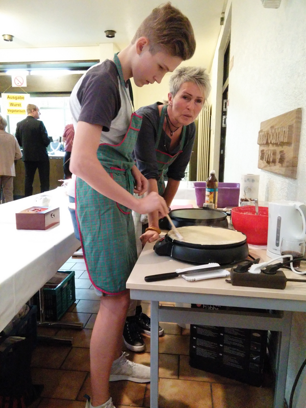 Doch auch dem Essensangebot wurde reichlich zugesprochen, so dass das "Rindfleisch mit Meerrettich" nach der Mittagszeit ausverkauft war. Ebenso hatten die Damen am Salatbuffet alle Hände voll zu tun, wie auch die Frauengemeinschaft am Kuchenbuffet, das am späten Nachmittag zur Neige ging. Zur Ergänzung hatten die Messdiener von St. Jakobus Waffeln und die Eltern der Jungen Kantorei Crepes gebacken. An beiden Tagen stand für die Gäste außerdem eine Cocktailbar der Jungen Kantorei bereit.