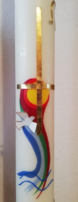 Gerade im Hinblick auf den Krieg in der Ukraine ist Hoffnung wichtig. Diese Hoffnung wird hier durch den Regenbogen vermittelt, der für den Bund Gottes mit allen Menschen steht. Er zeugt davon, dass alle gleich vor Gott sind, von ihm geliebt werden und sich auf ihn verlassen können. Die aufstrebende Taube ist ein Zeichen für den Wunsch nach Frieden. Das Kreuz als Hoffnungssymbol wider das Leiden wird durch die gelbe Sonne, die vom Regenbogen ausgeht, verstärkt. Diese Sonne spendet Wärme und Licht. Auch die Taube fliegt zu diesem Licht. Das Wasser, aus dem der Regenbogen entstammt, vermittelt uns, dass durch dieses Licht jede und jeder in der Gemeinschaft als Wassertropfen eben jene Hoffnung finden und hervorbringen kann und in den verschiedensten Farben strahlt.