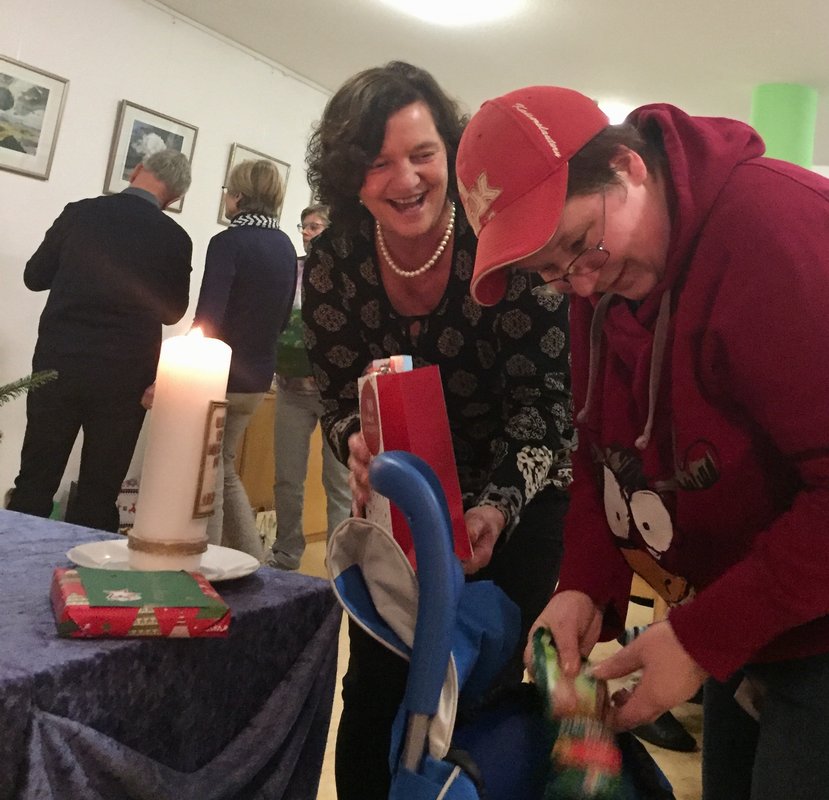 Strahlende Gesichter, in denen sich Vorfreude und Erwartung widerspiegelten, gab es am Freitag, 28.12.2018 im Wohnheim der Lebenshilfe im Waldspitzweg. Denn deren Bewohnerinnen und Bewohner sowie die der Wohngruppe und Wohnschule wussten, dass ihnen etwas Schönes bevorstand, nämlich die Überreichung der Geschenke aus der "Wunschzettel-Aktion" im Advent, die vorbereitet und organisiert wurde von Stefanie Pruschina, Maria Wissmann und einigen FirmbewerberInnen. Doch genauso groß war die Vorfreude auf den vorher stattfindenden weihnachtlichen ökumenischen Wortgottesdienst mit Pfarrerin Barbara Abel-Pohlack und Pastoralreferent Heinrich Schmith, der auch die gesungenen Weihnachtslieder an der Gitarre begleitete.