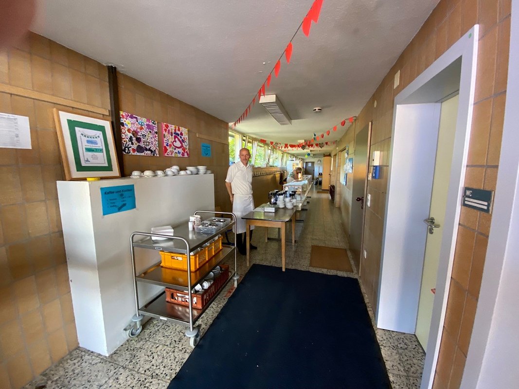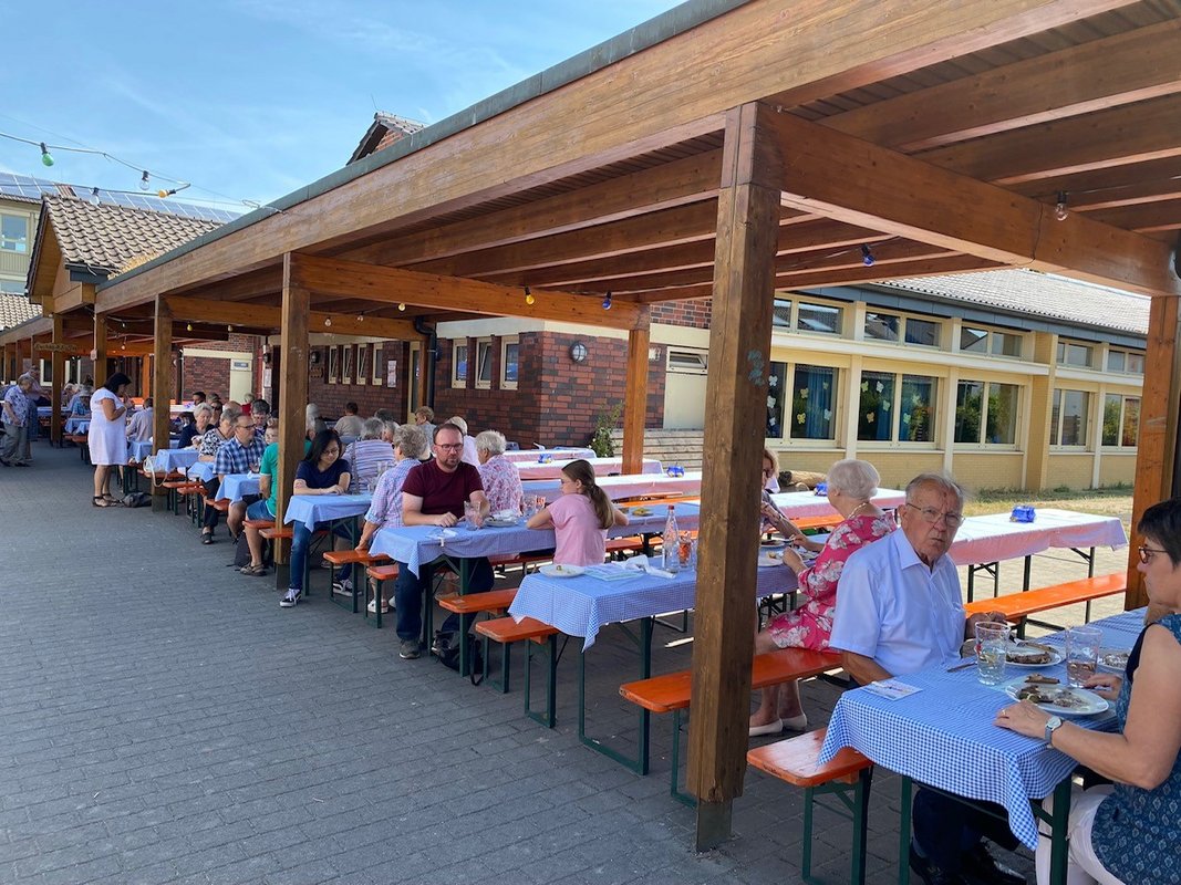 Nach den Gottesdiensten am Samstag und Sonntag erwartete die Gäste auf dem Gelände der Grundschule Süd ein vielseitiges Getränke- und Speiseangebot, wobei auch der am Sonntag zusätzlich zubereitete "Tafelspitz mit Meerrettich" und der beliebte "Handkäs mit Musik" großen Absatz fanden, auch das reichhaltig bestückte Kuchenbuffet war gegen Abend ausverkauft, so dass der Waffelstand der Messdiener gefragt war, ebenso deren Cocktailstand mit erfrischenden Getränken mit und ohne Alkohol. "Wir sind mit der Resonanz an beiden Tagen trotz Ferienzeit und Hitze zufrieden und auch die Stimmung war sehr gut", meinte Organisator Markus Hein und Vorsitzender des Gemeindeausschusses am Sonntagabend im Gespräch mit dem Schifferstadter Tagblatt. "Es ist uns das Wichtigste, dass wir als Kirche nach zwei Jahren Corona wieder zusammen kommen und Gemeinschaft pflegen können. Es kommt dabei nicht darauf an, großartige Gewinne zu erzielen, sondern gemeinsam zu feiern, auch außerhalb der Gottesdienste," so die Meinung von Markus Hein. Besonders habe ihn gefreut, dass Bürgermeister Klaus Habermann und Altbürgermeister Heinrich Hutzler nach den Feierlichkeiten anlässlich der 30-jährigen Partnerschaft mit Aichach dem Gemeindefest einen Besuch abstatteten, ebenso unter anderem Landrat Clemens Körner, Bürgermeisterin Ilona Volk, Bürgermeister i.R. Edwin Mayer, Pfarrerin i.R. Barbara Abel-Pohlack und Pfarrer i.R. Gerhard Grewer.