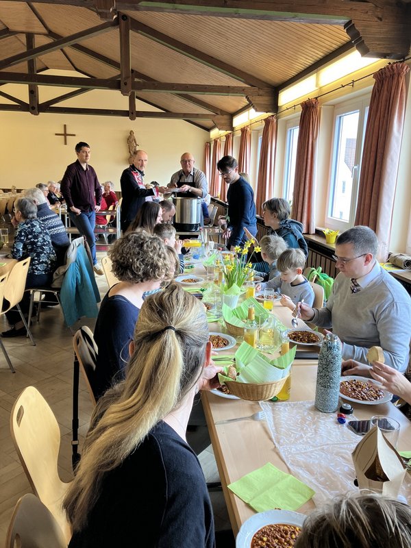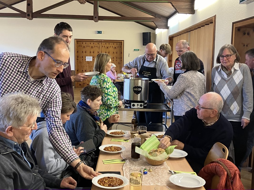 In gemütlicher Atmosphäre war es etwa 70 Gästen vergönnt, darunter auch die Pfarrer Stefan Mühl und Pfarrer Albrecht Effler sowie Diakon Helmut Weick und Pastoralreferent Heinrich Schmith, frisch zubereitetes "Chili con Carne" nach einem südamerikanischen Rezept und kross gebackenes Baguette zu genießen. Das Besondere an diesem Rezept ist das Beifügen von Kaffee und Kakaopulver, das für eine ganz besondere und leicht scharfe Note sorgte, was hervorragend geschmeckt hat. Zubereitet wurde das leckere Essen von Karl-Heinz Nagel und Regina Wölk und weiteren Mitgliedern des Gemeindeausschusses.