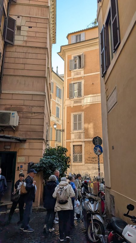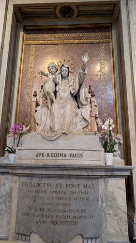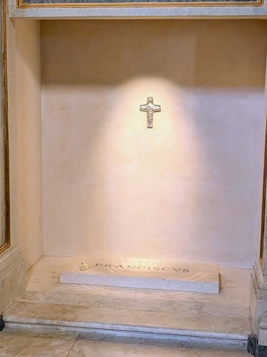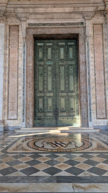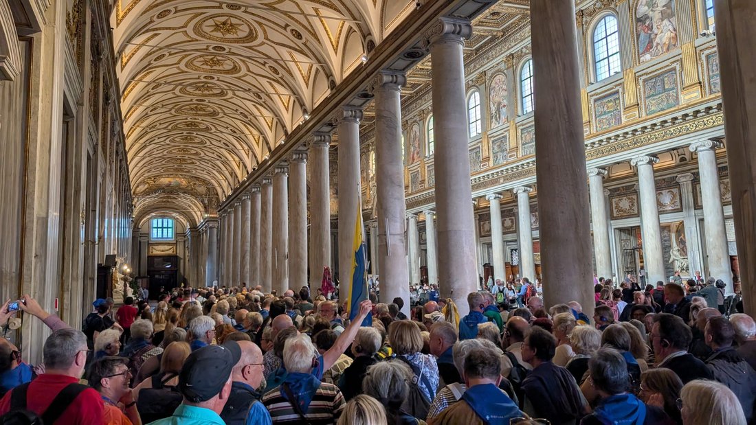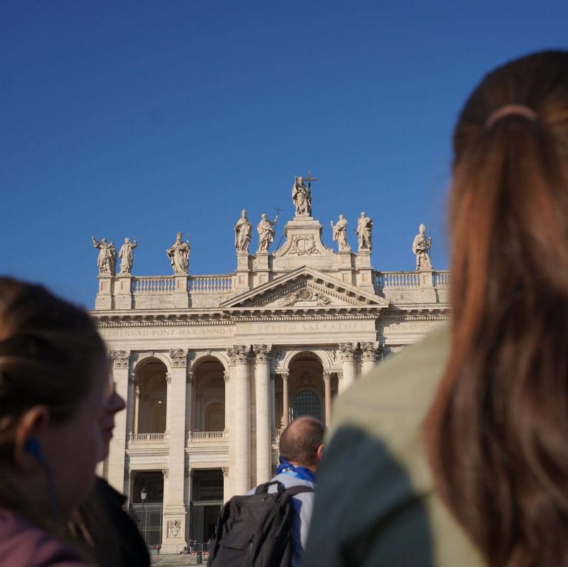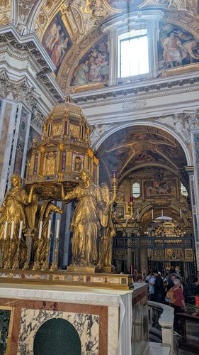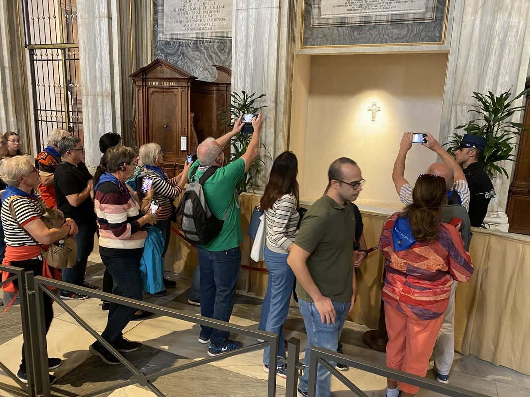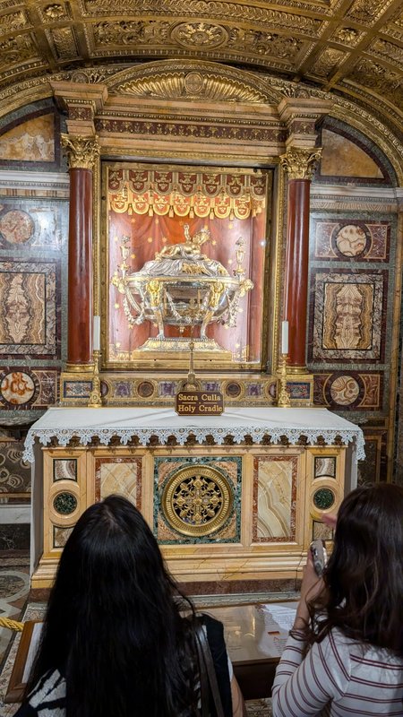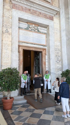 Nach einem Fußweg und der Mittagspause, die von einigen zur ersten Kontaktaufnahme mit dem römischen "Street-Food" oder auch Gelati genutzt wurde, ging es dann weiter in der Kirche Santa Maria Maggiore. Sie wurde zum Gedenken an das Konzil von Ephesus im Jahr 431, das die Gottesmutterschaft Marias festlegte, gebaut. Doch stand dort wohl schon ein Vorgängerbau im 4. Jahrhundert. Auch hier durchschritten wir die Heilige Pforte. Ein bewegender Moment war für viele der Besuch am Grab von Papst Franziskus in seiner römischen Lieblingskirche, in der auch die von ihm sehr verehrte Marienikone "Salus Populi Romani" zu sehen ist. Unter dem Papstaltar der Kirche Santa Maria Maggiore sollen sich Reste der Geburtskrippe Jesu befinden.