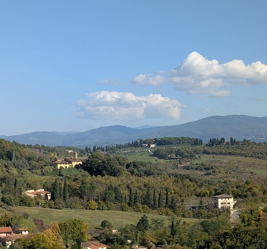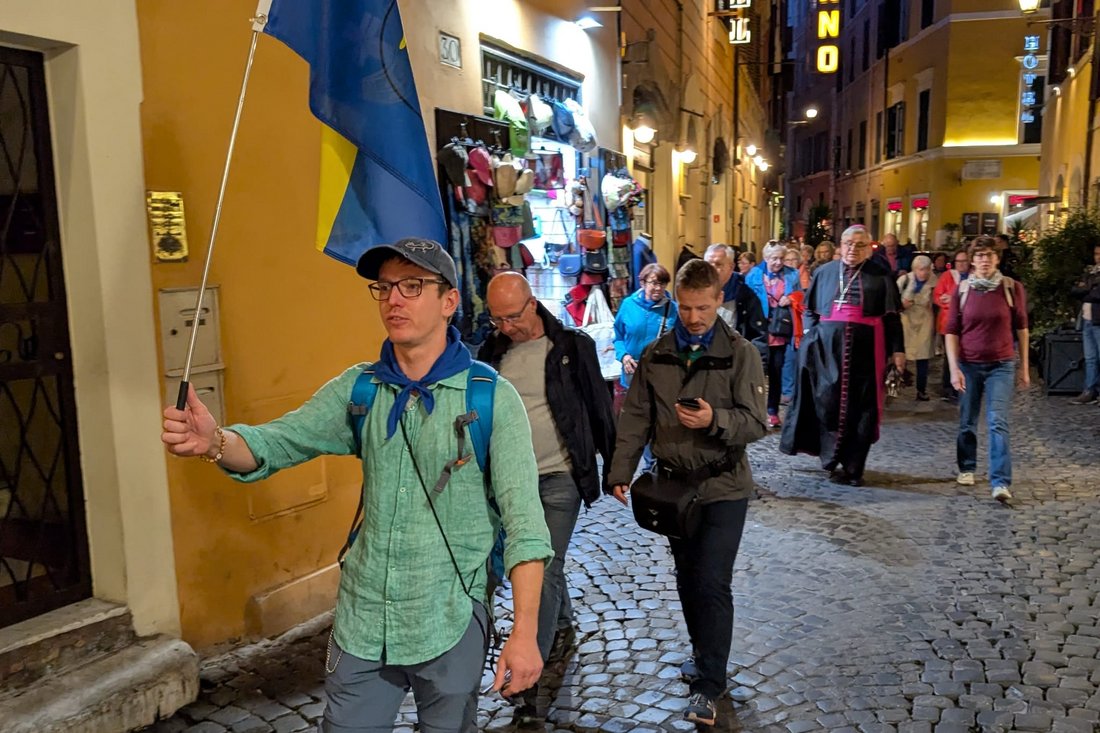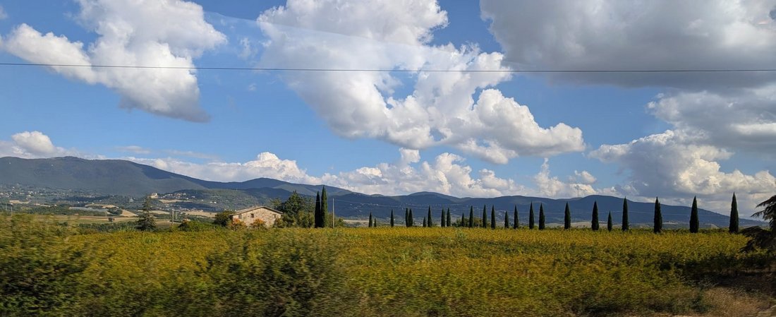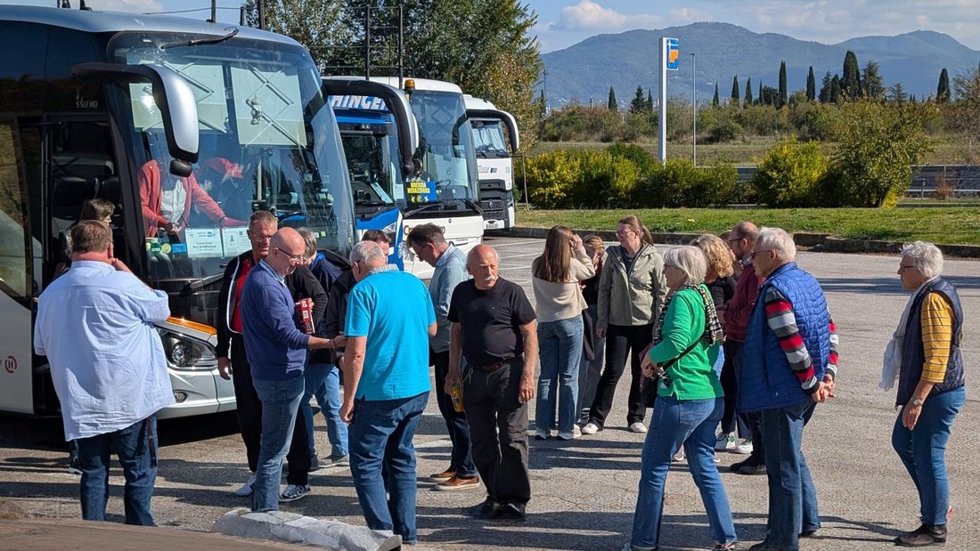 Die Fahrt führte uns entlang der Bergmassive der Dolomiten und dann durch zusehend mediterraner anmutende Landschaften. Wir kamen an so illustren Städten wie Verona, Mailand, Florenz, Pisa, Siena, Orvieto oder Assisi vorbei, die alle einen Besuch wert gewesen wären. Aber wir hatten ja ein anderes Ziel. Unterwegs auf den Rastplätzen kam es zu ersten Begegnungen mit den anderen Pilgergruppen aus dem Bistum Speyer und zu überraschenden Wiedersehen. So traf ein Mitfahrer aus unserem Bus eine Arbeitskollegin – beide hatten nicht voneinander gewusst, dass sie dabei sind.