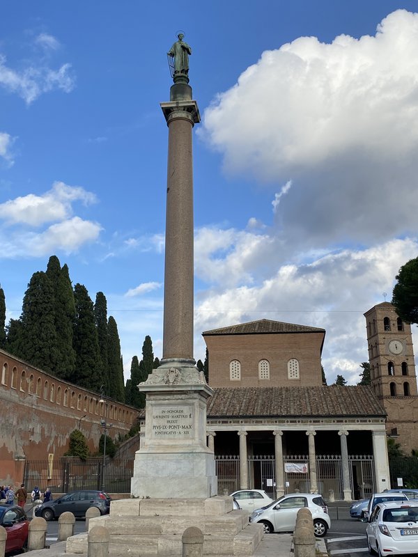 Ein anderer Teil unserer Gruppe machte sich per Metro und pedes auf den Weg zur Piazza del Popolo, einem typischen römischen Platz mit den markanten Zwillingskirchen. Nach einer Zeit dort ging es weiter zur Basilika San Lorenzo fuori le Mura (St. Laurentius vor den Mauern). Sie gehört zu den sieben Hauptkirchen Roms, die bei der Siebenkirchenwallfahrt besucht werden. In ihr liegt das Grab des heiligen Diakons und Märtyrers Laurentius, der ja der Patron einer der Schifferstadter Gemeinden ist.