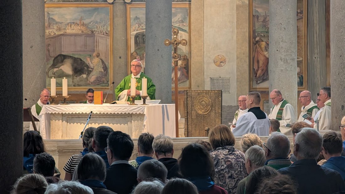 Die schönen Gesänge, die uralten Steine und die Gemeinschaft der Pilgerinnen und Pilger sorgten für eine ganz besondere Atmosphäre. In seiner Predigt ging der Bischof, ausgehend von den alten, kräftigen Säulen der Kirche, auf die Lesung aus dem Alten Testament ein, in der Mose für das Volk im Kampf gegen seine Gegner betete. Solange er die Hände erhoben hielt, war Israel im Vorteil. Schließlich mussten ihn zwei Personen stützen, damit seine Hände nicht sanken. Der Bischof lud dazu ein, sich zu fragen, wo wir Stütze oder Säule für die Kirche sind, Menschen, die sich dafür einsetzen, dass der Glaube weitergegeben wird, Pilger der Hoffnung in einer Zeit, die so viel Schweres erlebt. Der Glaube, der über so viele Jahrhunderte bewahrt wurde, gibt uns Grund zur Hoffnung. Aber die Frage Jesu aus dem Evangelium steht im Raum: "Wird der Menschensohn, wenn er wiederkommt, noch Glauben finden?"