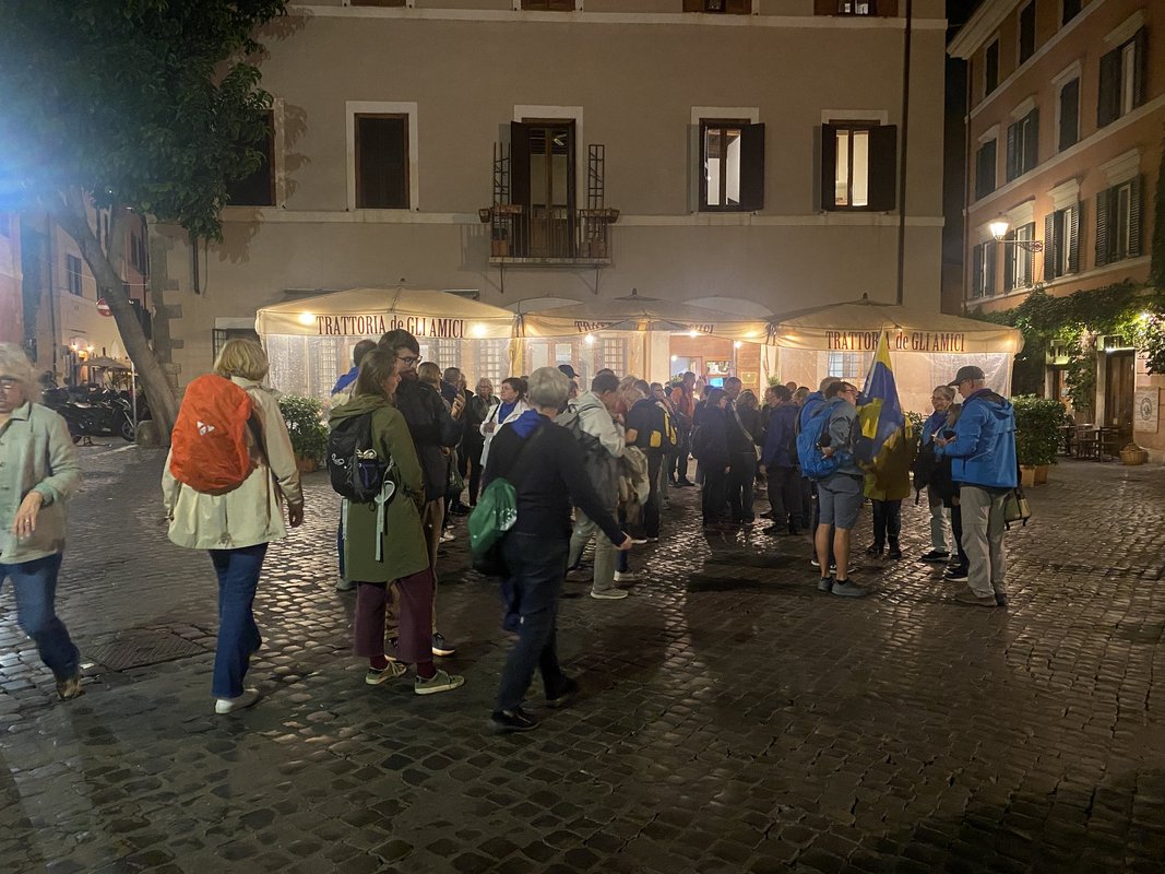Am Abend versammelten sich alle im malerischen Stadtteil Trastevere zu einem typisch italienischen Abendessen in der "Trattoria degli Amici", die von der Gemeinschaft Sant’ Egidio betrieben wird und in der auch Menschen mit Beeinträchtigung arbeiten. Das sehr gute Essen, der freundliche Service und einige Flaschen guten Weins ließen schnell eine fröhliche Stimmung aufkommen, in der manches Erlebnis der vergangenen Tage nachklingen konnte.