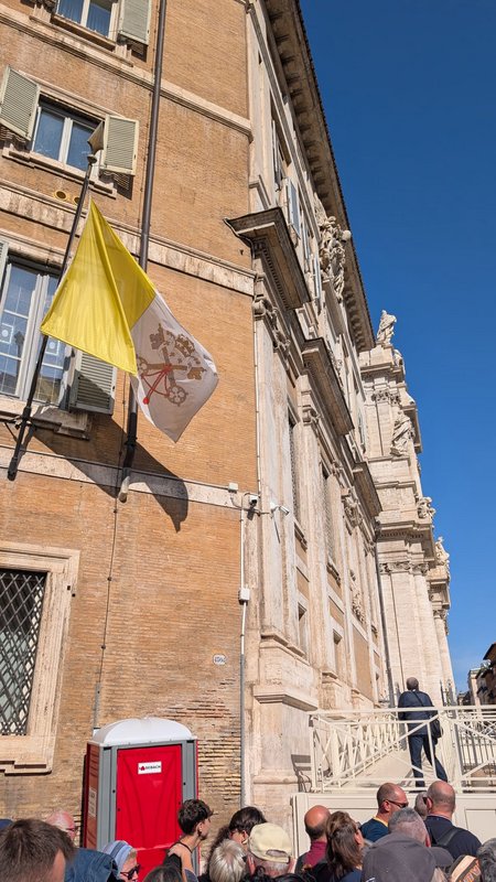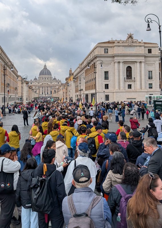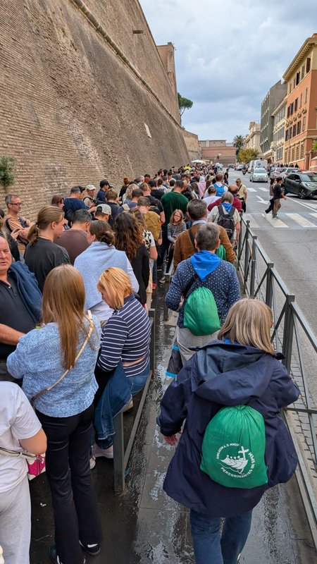 An unserem letzten Tag in Rom gab es noch einmal einen großen Höhepunkt, der für viele sehr bewegend war: die Teilnahme an der Papstaudienz mit Leo XIV. Dafür sind wir wieder sehr früh aufgestanden und nach einem schnellen Frühstück in die Stadt gefahren. Dort war schon ziemlich viel los. Vor den Kolonnaden des Petersplatzes bildete sich eine lange Schlange, in die wir uns geduldig einreihten. Menschen aus aller Herren Länder schienen gekommen zu sein, wie sich später auch bei der Nennung der Gruppen bestätigte.