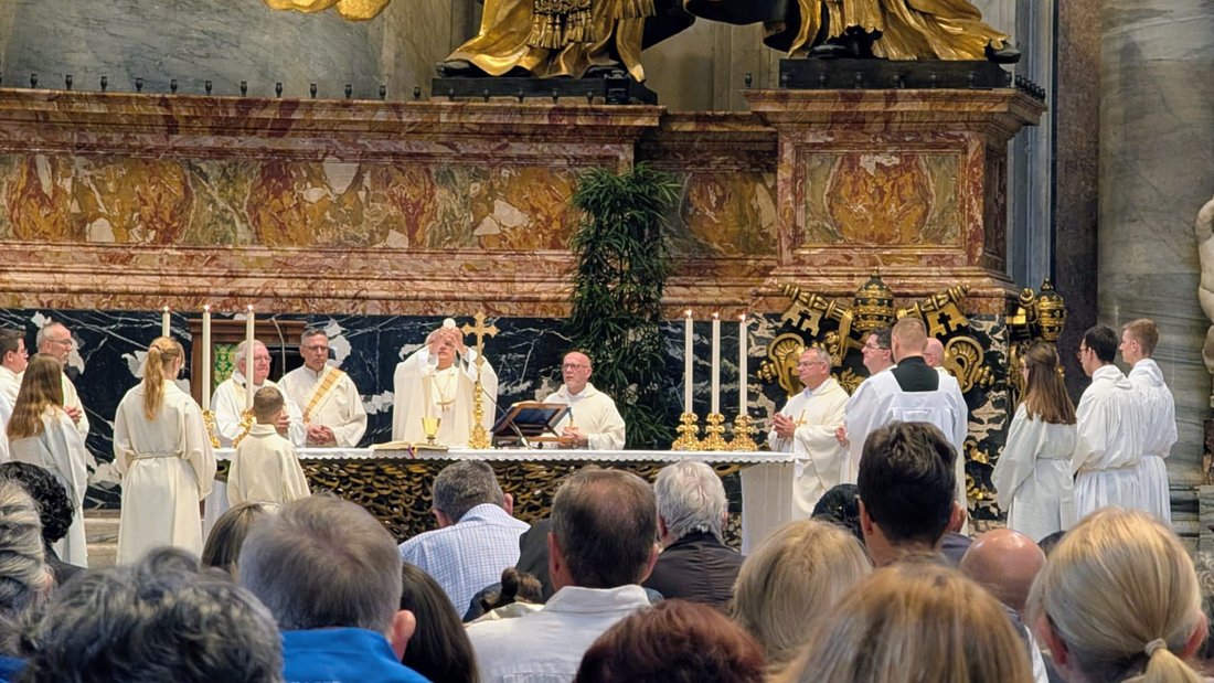 Anschließend feierten wir Eucharistie am Cathedra-Altar, unter dem berühmten Heilig-Geist-Fenster. Dort Gottesdienst zu feiern, ist ein großes Erlebnis. Ganz besonders freuten sich unsere drei Messdienerinnen, dass sie im Petersdom ministrieren durften. Die Predigt hielt Generalvikar Markus Magin. Er wies auf die "Cathedra Petri" hoch über dem Altar hin, einen Prunksessel aus Gold. Doch dahinter verbirgt sich ein einfacher Stuhl. Es ist wichtig, hinter die Fassade zu schauen, das Eigentliche zu entdecken. Das gilt auch für das Evangelium, in dem Petrus Jesus als den Messias, den Sohn Gottes bekannte. Er sah das Eigentliche, den Wesenskern Jesu. Diesen Blick auf Jesus Christus sollen wir entdecken, auch hier in Rom. Ihn gilt es zu finden, auch in den Krisen und Schwierigkeiten unserer Zeit und unserer Kirche. Mit Blick auf die anstehenden Strukturveränderungen im Bistum Speyer zitierte der Generalvikar abschließend Papst Franziskus: "Wer die Krise der Kirche betrachtet ohne den Blick auf Jesus Christus ist wie einer, der einen Leichnam seziert."