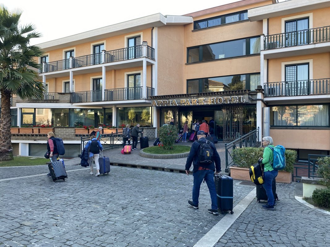 Gegen 16:30 Uhr kamen wir dann nach insgesamt (an beiden Tagen) 1.264 Kilometern in Rom an. Nachdem wir noch ein Gruppenbild gemacht hatten, bezogen wir unsere Zimmer im Hotel Appia Park, welches für fünf Nächte unser Quartier sein wird. Nun freuen wir uns auf das Abendessen und den ersten Tag in Rom, der uns zu den beiden Papstbasiliken San Giovanni im Lateran und Santa Maria Maggiore führen wird.