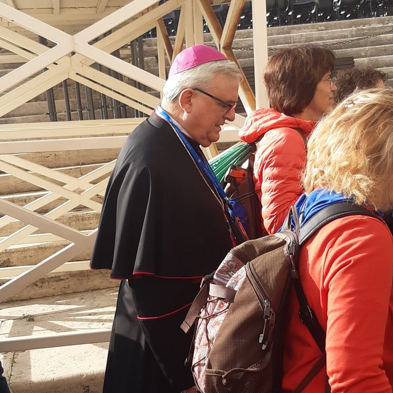 Bischof Dr. Wiesemann sprach in seiner Predigt von den vielen schönen Momenten auf dieser Wallfahrt, die jeder und jede persönlich erlebt hat. Er selbst hatte in diesen Tagen viele Erinnerungen an seine Studienzeit in Rom und seine Priesterweihe vor 40 Jahren. So sprach er auch von seiner ersten Begegnung mit Papst Johannes Paul II., dessen Gedenktag wir heute feierten. Er erinnerte sich, dass der Papst betont habe, dass das innere Hören wichtig sei. Auf dieses Hören, so Bischof Wiesemann, komme es an. Das Hören auf den Geist, der auch in der Wallfahrtsgemeinschaft sich in Vielfalt äußert, soll innere Kraft und Stärke auch im Alltag geben. So können wir für andere zu Pilgern der Hoffnung werden.