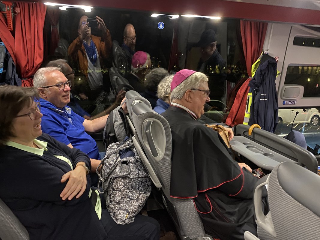 Früh am Morgen waren alle 45 Teilnehmerinnen und Teilnehmer der Rom-Wallfahrt der Pfarrei Hl. Edith Stein Schifferstadt pünktlich am vereinbarten Treffpunkt am Südbahnhof erschienen. Schnell waren die Koffer eingeladen, und los ging das Abenteuer. Busfahrer Matthias und der Leiter der Reise, Pfr. Stefan Mühl, begrüßten alle an Bord. Der Bus fuhr in den beginnenden Tag hinein, zunächst über Heilbronn, Stuttgart, Ulm und das Allgäu zum Grenzübergang nach Österreich, dann weiter über den Fernpass und den Brenner nach Südtirol und ins Trentino.