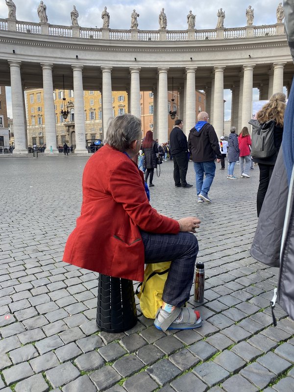 Nachdem wir die Sicherheitskontrollen passiert hatten, mussten wir feststellen, dass es keine freien Sitzplätze mehr gab – kein Wunder bei geschätzten 60.000 bis 80.000 Personen auf dem Petersplatz. Also suchten wir uns gute Stehplätze in der Nähe einer Absperrung, von der wir hofften, dass das Papamobil daran vorbeikommen würde.