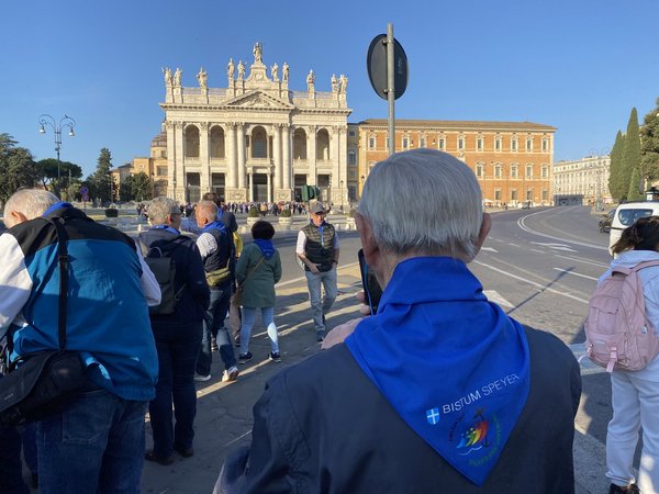 Der heutige Tag war prall gefüllt. Er begann nach der ersten Nacht in unserem Hotel mit einem wiederum reichhaltigen Frühstück. Dann brachen wir auf zur Basilika San Giovanni im Lateran, der eigentlichen Bischofskirche des Papstes und "Mutter und Haupt aller Kirchen". Dort trafen wir uns mit allen Pilgerinnen und Pilger aus dem Bistum Speyer.