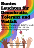 Buntes Leuchten für Demokratie, Toleranz und Vielfalt - das ist das Motto der Kundgebung am Freitag, 12.04.2024, 18 Uhr auf dem Rathausvorplatz - Wir laden herzlich dazu ein!