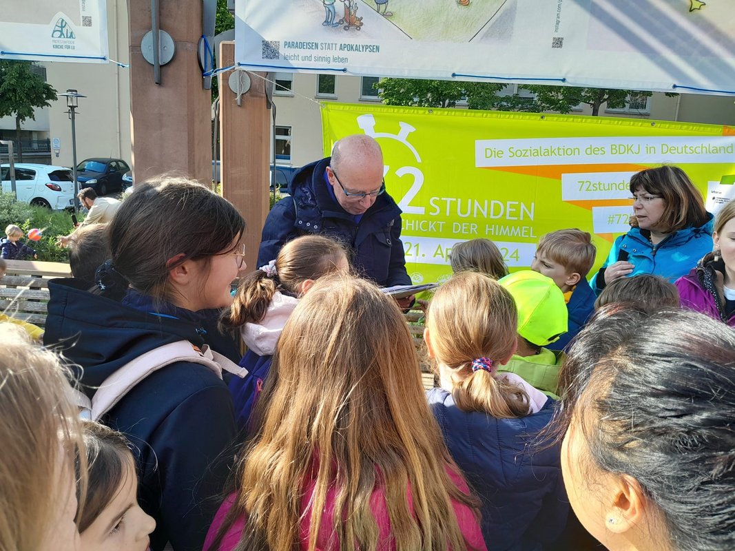 Und der Himmel schickt die über 50-köpfige Gruppe Schifferstadter Minis & Friends auf das Außengelände der Kita St. Jakobus. Mit einer sehr großen Delegation haben die Kinder und Jugendlichen der Gruppe zusammen mit Pfr. Stefan Mühl, einigen Betreuern und Eltern heute, Donnerstag, um 17:07 Uhr ihr Aufgabe erhalten.