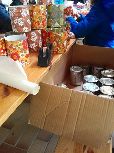 Und wenn es regnet, dann wird schon mal das Kinderfest vorbereitet: z.B. die Dosen für das Dosenwerfen ...