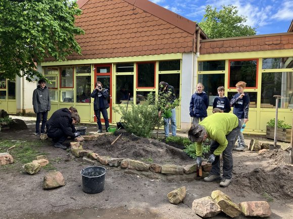 Bereits einen Tag nach dem Projektbeginn in der Kindertagesstätte St. Jakobus kam man ins Staunen. Denn nach dem Motto "Viele Hände – schnelles Ende" war schon zu erahnen, dass die Aktion zum anberaumten Ende am Sonntag, 17:07 Uhr, zur Freude aller erfüllt werden kann. Schon von weitem hörte man die gute Stimmung der Kinder und Jugendlichen, die allesamt kräftig mit zupackten. Während freitags der Hunger vom Kita-Team gestillt wurde, standen samstags Pfarreimitglieder bereit, um für die Verpflegung zu sorgen. Dazu kam währenddessen von den Eltern allerlei Süßes und Deftiges für "zwischendurch" dazu, so dass sich jederzeit neu gestärkt werden konnte. Auch vor Ort gebackene Crepes kamen sehr gut an. Einige Bürgerinnen und Bürger kamen interessehalber dazu und griffen auch mal spontan zum Spaten. "Die Eltern versorgen uns super, auch Materialspenden wurden abgegeben", freut sich Pfarrer Stefan Mühl, der ebenso wie Kita-Leiterin Tina Scharfenberger stets vor Ort war und kräftig zupackte und die auch für alle Fragen ein offenes Ohr hatten.