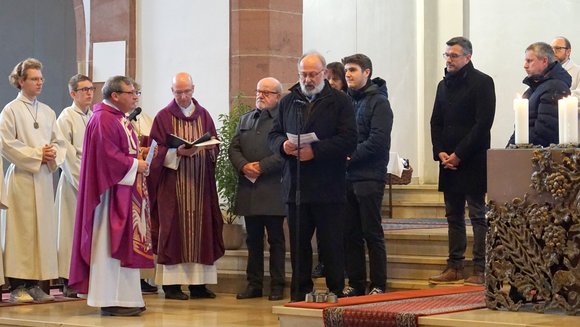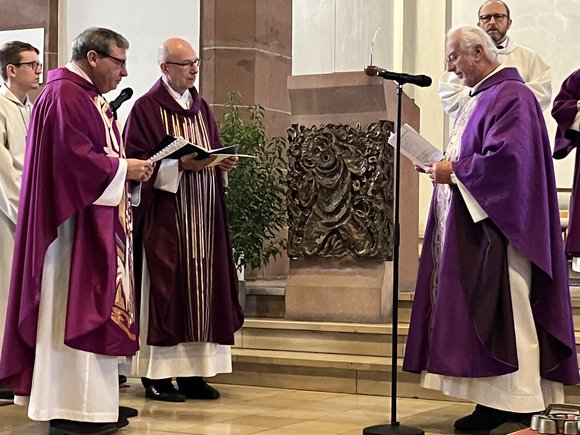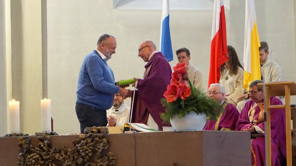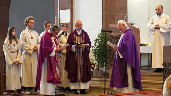 Die Amtseinführung von Pfarrer Stefan Mühl übernahm Dekan Markus Hary aus Bobenheim-Roxheim. Dazu galt es ein Bischöfliches Ernennungsschreiben zu verlesen und von Seiten des neuen Pfarrers das Amtsversprechen abzulegen. Die weiteren Regularien sahen die Übergabe des Schlüssels der Pfarrkirche als Zeichen des neuen Amtes vor. "Pfarrer Stefan Mühl hat sich eine Pfarrei herausgesucht, die dabei den notwendigen Beistand liefert", hob Dekan Hary in seiner Ansprache hervor. Zum einen nannte er den Apostel Jakobus, der durch den Pilgerweg wieder sehr populär sei. Auch Pfarrer Mühl habe sich auf diesen Weg gemacht und werde ihn auch noch weitergehen. Gehen, innehalten und auch ruhen, bedeute, dass der Weg den Blick nach außen, aber auch nach innen lenke, beide miteinander korrespondierten und mit der umgebenden Welt spreche. Genau da habe er einen weiteren himmlischen Begleiter: Das Herz Jesu, das zum Nachdenken anrege, für welche Menschen dieses Herz eigentlich schlage. Der weitere himmlische Begleiter könnte darauf eine Antwort haben: für die Armen. Denn sie, so erzähle es die Legende des Heiligen Laurentius, seien der wahre Schatz der Kirche. Und dann wäre noch die Heilige Edith Stein, die bis heute eine herausfordernde Persönlichkeit sei. "Sie hat, darauf vertrauen wir, mit Gottes Hilfe ihren Weg in der Kirche und mit ihren Glaubensschwestern und -brüdern im jüdischen Glauben gefunden", betonte der Dekan. Bei so vielen himmlischen aber natürlich auch irdischen Mitstreitern, Begleiterinnen und Begleitern, sei ihm für seinen weiteren Lebensweg in der Pfarrei Heilige Edith nicht bange.