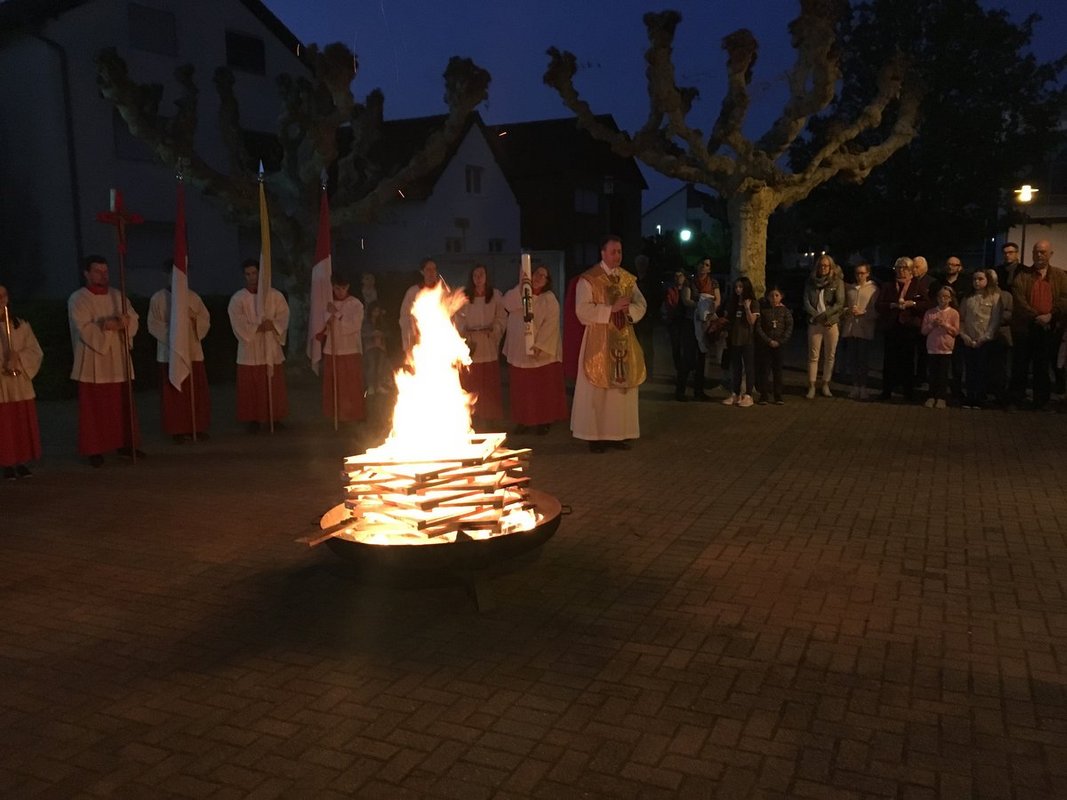 Voraus ging in den katholischen Gemeinden jeweils eine Lichtfeier auf dem Vorplatz der Kirchen, in denen am Osterfeuer die Osterkerzen entzündet und in die Kirchen hineingetragen wurden. In St. Jakobus wurden dabei außerdem die am Karfreitag als Zeichen des eigenen Leides kleinen Holzkreuze, die bei der Kreuzverehrung niedergelegt wurden, ins Osterfeuer geworfen. "Sie verbrennen, werden zum Licht und gehen auf im Osterfeuer der Barmherzigkeit und Liebe Gottes", betonte Pfarrer Albrecht Effler dabei.