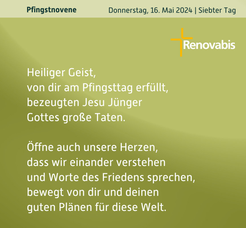 Wir danken Renovabis für die Erlaubnis zur Veröffentlichung der Impulse und Text der Pfingstnovene 2024 auf unserer Homepage.
